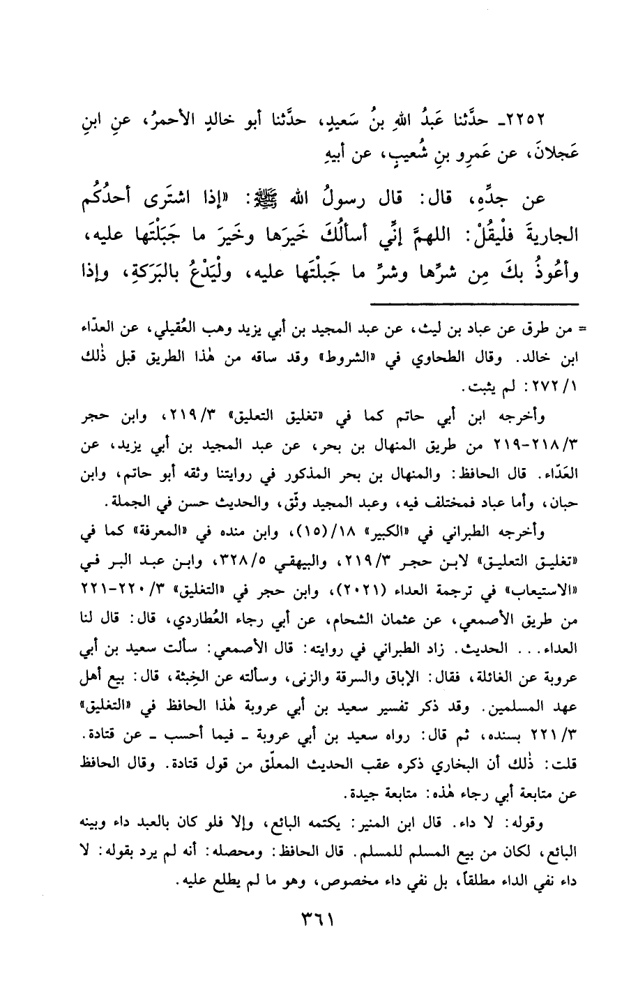 2252- حَدَّثَنَا عَبْدُ اللهِ بْنُ سَعِيدٍ ، حَدَّثَنَا أَبُو خَالِدٍ الأَحْمَرُ ، عَنِ ابْنِ عَجْلاَنَ ، عَنْ عَمْرِو بْنِ شُعَيْبٍ ، عَنْ أَبِيهِ ، عَنْ جَدِّهِ ، قَالَ : قَالَ رَسُولُ اللهِ صَلَّى الله عَليْهِ وسَلَّمَ : إِذَا اشْتَرَى أَحَدُكُمُ الْجَارِيَةَ ، فَلْيَقُلِ : اللَّهُمَّ إِنِّي أَسْأَلُكَ خَيْرَهَا وَخَيْرَ مَا جَبَلْتَهَا عَلَيْهِ ، وَأَعُوذُ بِكَ مِنْ شَرِّهَا وَشَرِّ مَا جَبَلْتَهَا عَلَيْهِ ، وَلْيَدْعُ بِالْبَرَكَةِ ، وَإِذَا اشْتَرَى أَحَدُكُمْ بَعِيرًا ، فَلْيَأْخُذْ بِذِرْوَةِ سَنَامِهِ ، وَلْيَدْعُ بِالْبَرَكَةِ ، وَلْيَقُلْ مِثْلَ ذَلِكَ.