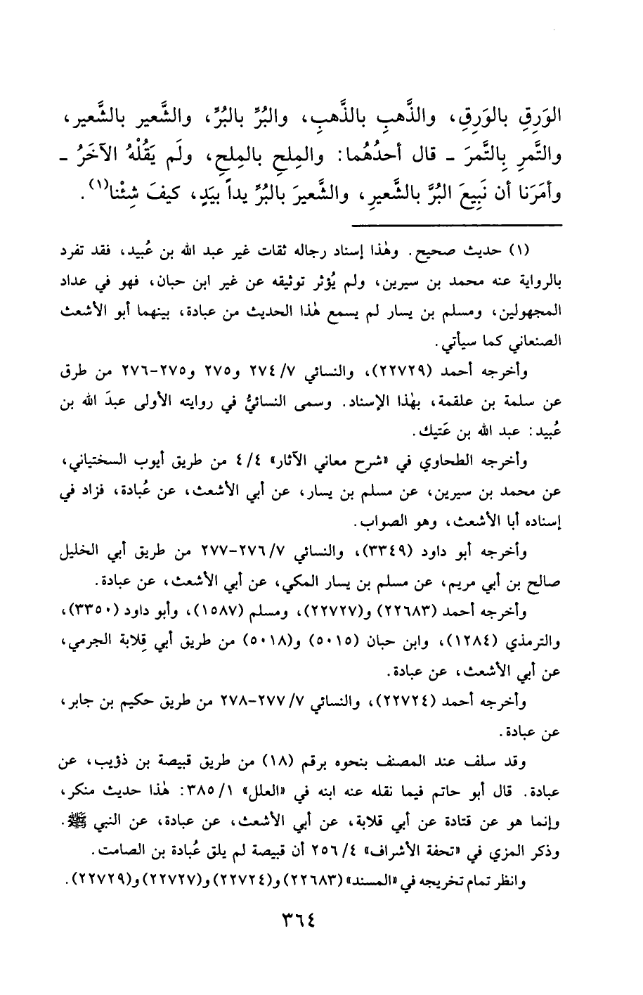 (¬1) حديث صحيح. وهذا إسناد رجاله ثقات غير عبد الله بن عُبيد، فقد تفرد بالرواية عنه محمَّد بن سيرين، ولم يُؤثر توثيقه عن غير ابن حبان، فهو في عداد المجهولين، ومسلم بن يسار لم يسمع هذا الحديث من عبادة، بينهما أبو الأشعث الصنعاني كما سيأتي.