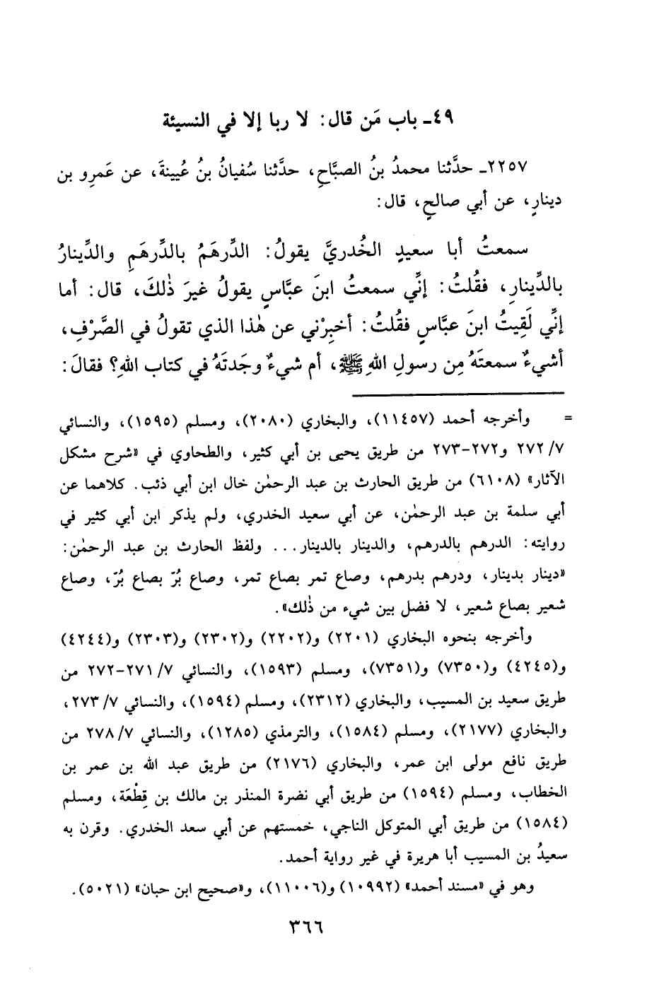 2257- حَدَّثَنَا مُحَمَّدُ بْنُ الصَّبَّاحِ ، حَدَّثَنَا سُفْيَانُ بْنُ عُيَيْنَةَ ، عَنْ عَمْرِو بْنِ دِينَارٍ ، عَنْ أَبِي صَالِحٍ ، قَالَ : سَمِعْتُ أَبَا سَعِيدٍ الْخُدْرِيَّ يَقُولُ : الدِّرْهَمُ بِالدِّرْهَمِ ، وَالدِّينَارُ بِالدِّينَارِ ، فَقُلْتُ : إِنِّي سَمِعْتُ ابْنَ عَبَّاسٍ يَقُولُ غَيْرَ ذَلِكَ ، قَالَ : أَمَا إِنِّي لَقِيتُ ابْنَ عَبَّاسٍ ، فَقُلْتُ : أَخْبِرْنِي عَنْ هَذَا الَّذِي تَقُولُ فِي الصَّرْفِ , أَشَيْءٌ سَمِعْتَهُ مِنْ رَسُولِ اللهِ صَلَّى الله عَليْهِ وسَلَّمَ ؟ أَمْ شَيْءٌ وَجَدْتَهُ فِي كِتَابِ اللهِ ؟ فَقَالَ : مَا وَجَدْتُهُ فِي كِتَابِ اللهِ ، وَلاَ سَمِعْتُهُ مِنْ رَسُولِ اللهِ صَلَّى الله عَليْهِ وسَلَّمَ ، وَلَكِنْ أَخْبَرَنِي أُسَامَةُ بْنُ زَيْدٍ ، أَنَّ رَسُولَ اللهِ صَلَّى الله عَليْهِ وسَلَّمَ قَالَ : إِنَّمَا الرِّبَا فِي النَّسِيئَةِ.