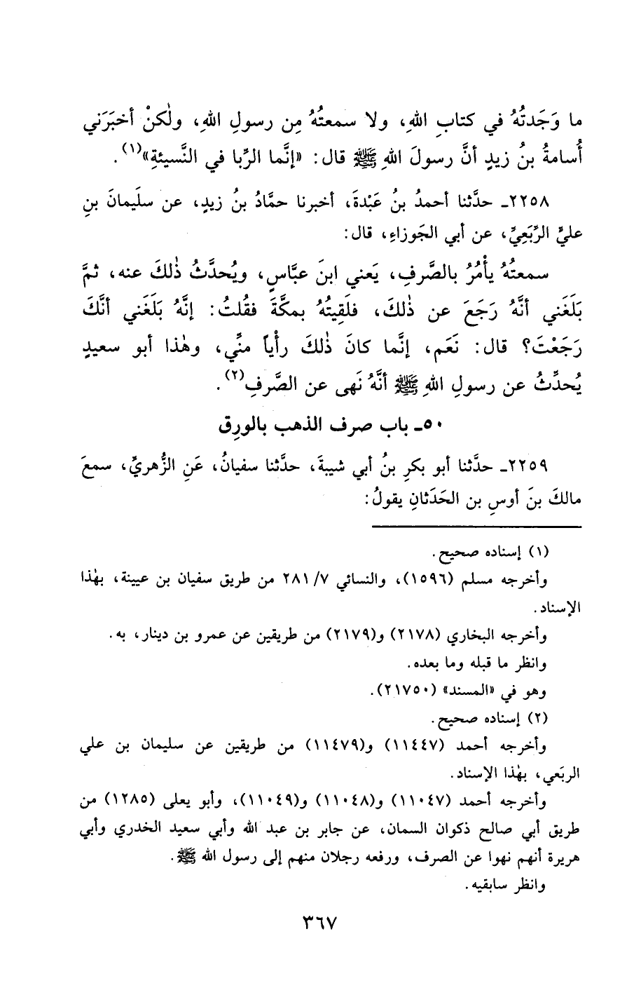 2259- حَدَّثَنَا أَبُو بَكْرِ بْنُ أَبِي شَيْبَةَ ، حَدَّثَنَا سُفْيَانُ ، عَنِ الزُّهْرِيِّ ، سَمِعَ مَالِكَ بْنَ أَوْسِ بْنِ الْحَدَثَانِ يَقُولُ : سَمِعْتُ عُمَرَ يَقُولُ : قَالَ رَسُولُ اللهِ صَلَّى الله عَليْهِ وسَلَّمَ : الذَّهَبُ بِالْوَرِقِ رِبًا ، إِلاَّ هَاءَ وَهَاءَ.
