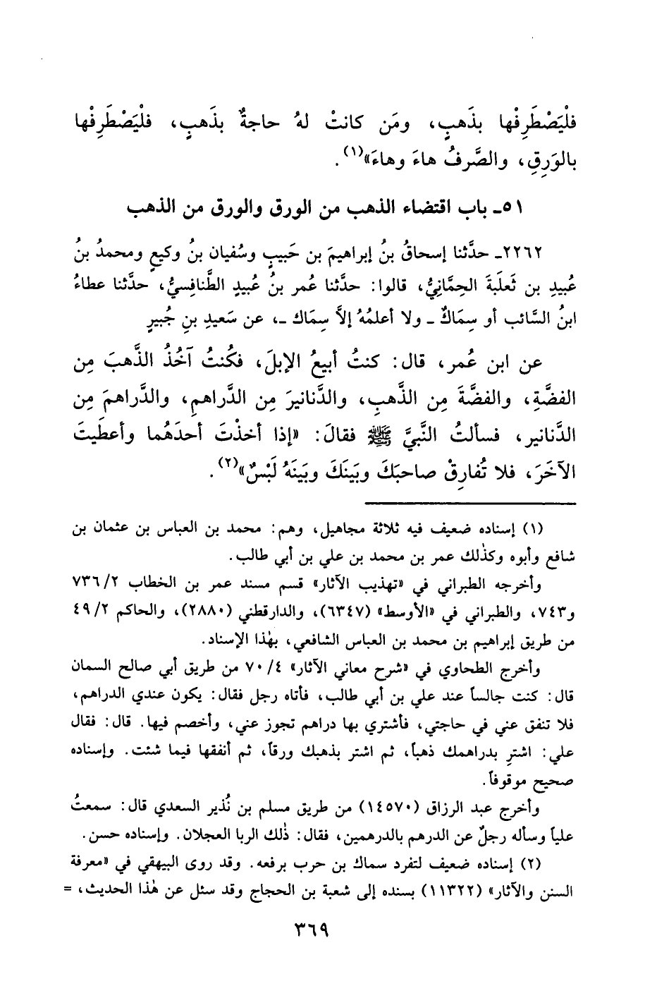 2262- حَدَّثَنَا إِسْحَاقُ بْنُ إِبْرَاهِيمَ بْنِ حَبِيبٍ ، وَسُفْيَانُ بْنُ وَكِيعٍ ، وَمُحَمَّدُ بْنُ عُبَيْدِ بْنِ ثَعْلَبَةَ الْحِمَّانِيُّ ، قَالُوا : حَدَّثَنَا عُمَرُ بْنُ عُبَيْدٍ الطَّنَافِسِيُّ ، حَدَّثَنَا عَطَاءُ بْنُ السَّائِبِ ، أَوْ سِمَاكٌ ، وَلاَ أَعْلَمُهُ إِلاَّ سِمَاكٌ ، عَنْ سَعِيدِ بْنِ جُبَيْرٍ ، عَنِ ابْنِ عُمَرَ ، قَالَ : كُنْتُ أَبِيعُ الإِبِلَ ، فَكُنْتُ آخُذُ الذَّهَبَ مِنَ الْفِضَّةِ ، وَالْفِضَّةَ مِنَ الذَّهَبِ ، وَالدَّنَانِيرَ مِنَ الدَّرَاهِمِ ، وَالدَّرَاهِمَ مِنَ الدَّنَانِيرِ ، فَسَأَلْتُ النَّبِيَّ صَلَّى الله عَليْهِ وسَلَّمَ ، فَقَالَ : إِذَا أَخَذْتَ أَحَدَهُمَا ، وَأَعْطَيْتَ الآخَرَ ، فَلاَ تُفَارِقْ صَاحِبَكَ وَبَيْنَكَ وَبَيْنَهُ لَبْسٌ.
