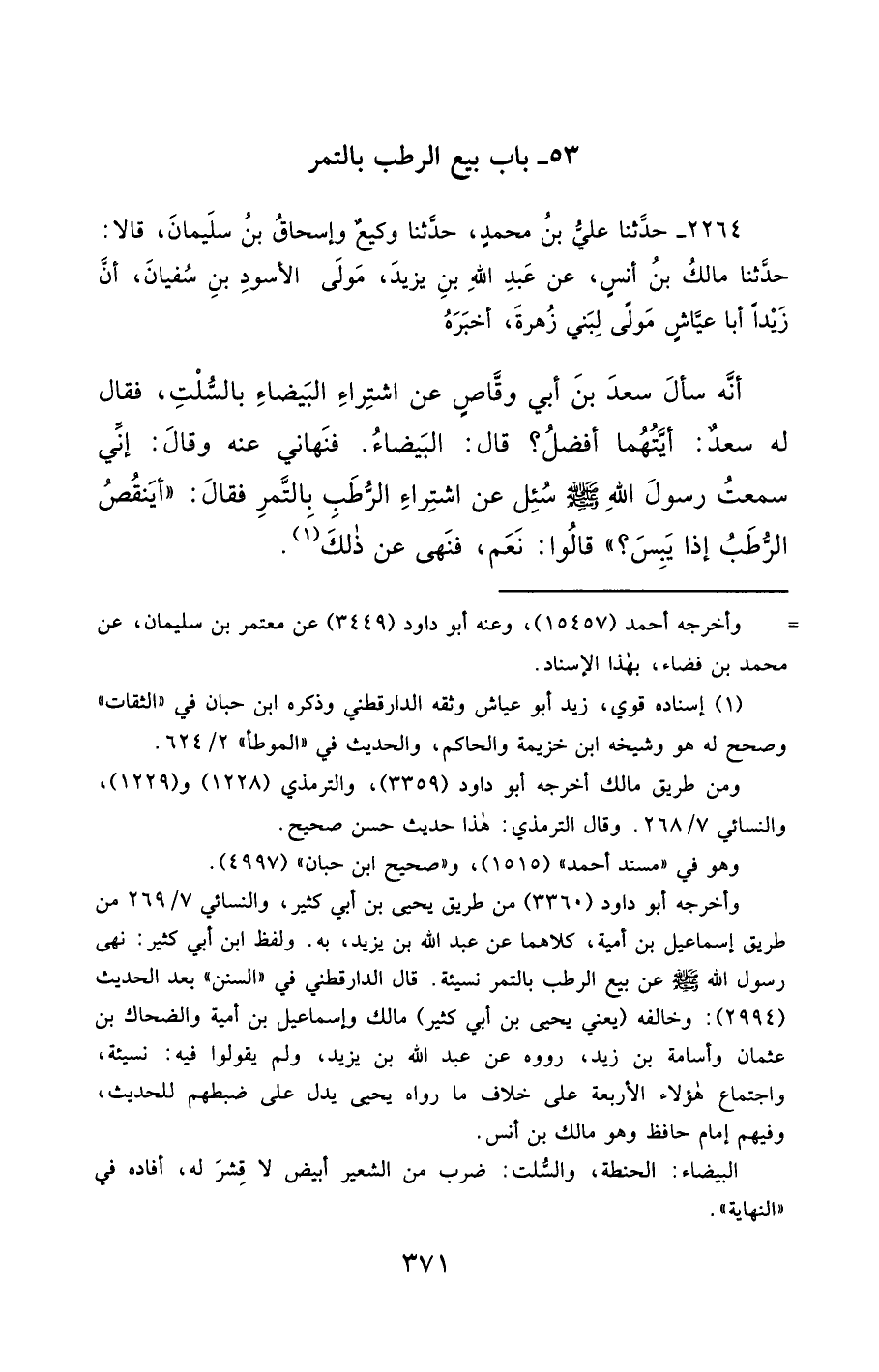 2264- حَدَّثَنَا عَلِيُّ بْنُ مُحَمَّدٍ ، حَدَّثَنَا وَكِيعٌ ، وَإِسْحَاقُ بْنُ سُلَيْمَانَ ، قَالاَ : حَدَّثَنَا مَالِكُ بْنُ أَنَسٍ ، عَنْ عَبْدِ اللهِ بْنِ يَزِيدَ ، مَوْلَى الأَسْوَدِ بْنِ سُفْيَانَ ، أَنَّ زَيْدًا أَبَا عَيَّاشٍ ، مَوْلًى لِبَنِي زُهْرَةَ أَخْبَرَهُ , أَنَّهُ سَأَلَ سَعْدَ بْنَ أَبِي وَقَّاصٍ عَنِ اشْتِرَاءِ الْبَيْضَاءِ بِالسُّلْتِ ، فَقَالَ لَهُ سَعْدٌ : أَيَّتُهُمَا أَفْضَلُ ؟ قَالَ : الْبَيْضَاءُ ، فَنَهَانِي عَنْهُ ، وَقَالَ : إِنِّي سَمِعْتُ رَسُولَ اللهِ صَلَّى الله عَليْهِ وسَلَّمَ سُئِلَ عَنِ اشْتِرَاءِ الرُّطَبِ بِالتَّمْرِ ، فَقَالَ : أَيَنْقُصُ الرُّطَبُ إِذَا يَبِسَ ؟ قَالُوا : نَعَمْ ، فَنَهَى عَنْ ذَلِكَ.