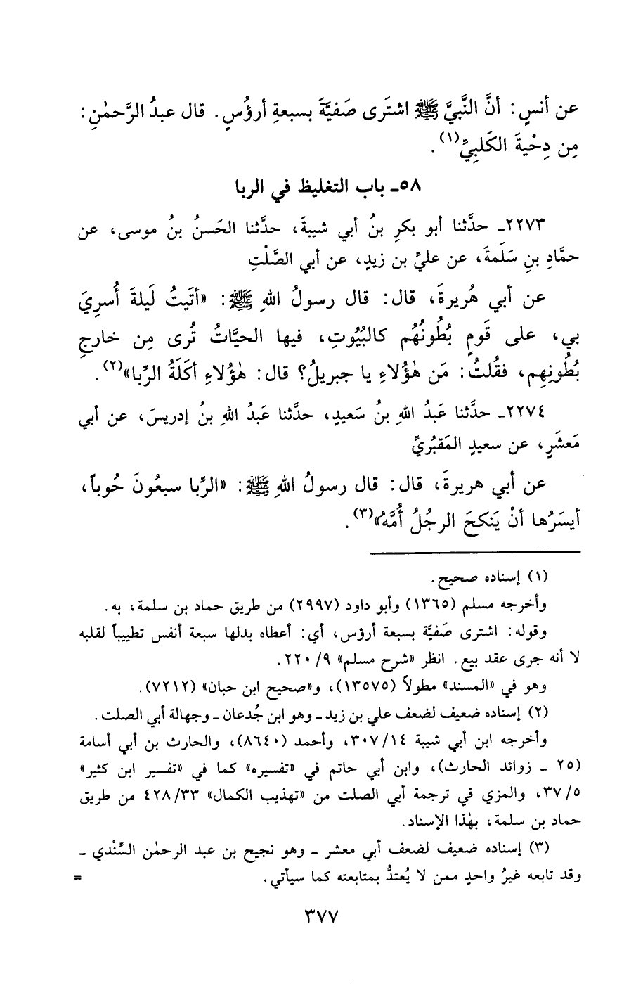 2273- حَدَّثَنَا أَبُو بَكْرِ بْنُ أَبِي شَيْبَةَ ، حَدَّثَنَا الْحَسَنُ بْنُ مُوسَى ، عَنْ حَمَّادِ بْنِ سَلَمَةَ ، عَنْ عَلِيِّ بْنِ زَيْدٍ ، عَنْ أَبِي الصَّلْتِ ، عَنْ أَبِي هُرَيْرَةَ ، قَالَ : قَالَ رَسُولُ اللهِ صَلَّى الله عَليْهِ وسَلَّمَ : أَتَيْتُ لَيْلَةَ أُسْرِيَ بِي عَلَى قَوْمٍ بُطُونُهُمْ كَالْبُيُوتِ ، فِيهَا الْحَيَّاتُ تُرَى مِنْ خَارِجِ بُطُونِهِمْ ، فَقُلْتُ : مَنْ هَؤُلاَءِ يَا جِبْرَائِيلُ ؟ قَالَ : هَؤُلاَءِ أَكَلَةُ الرِّبَا.