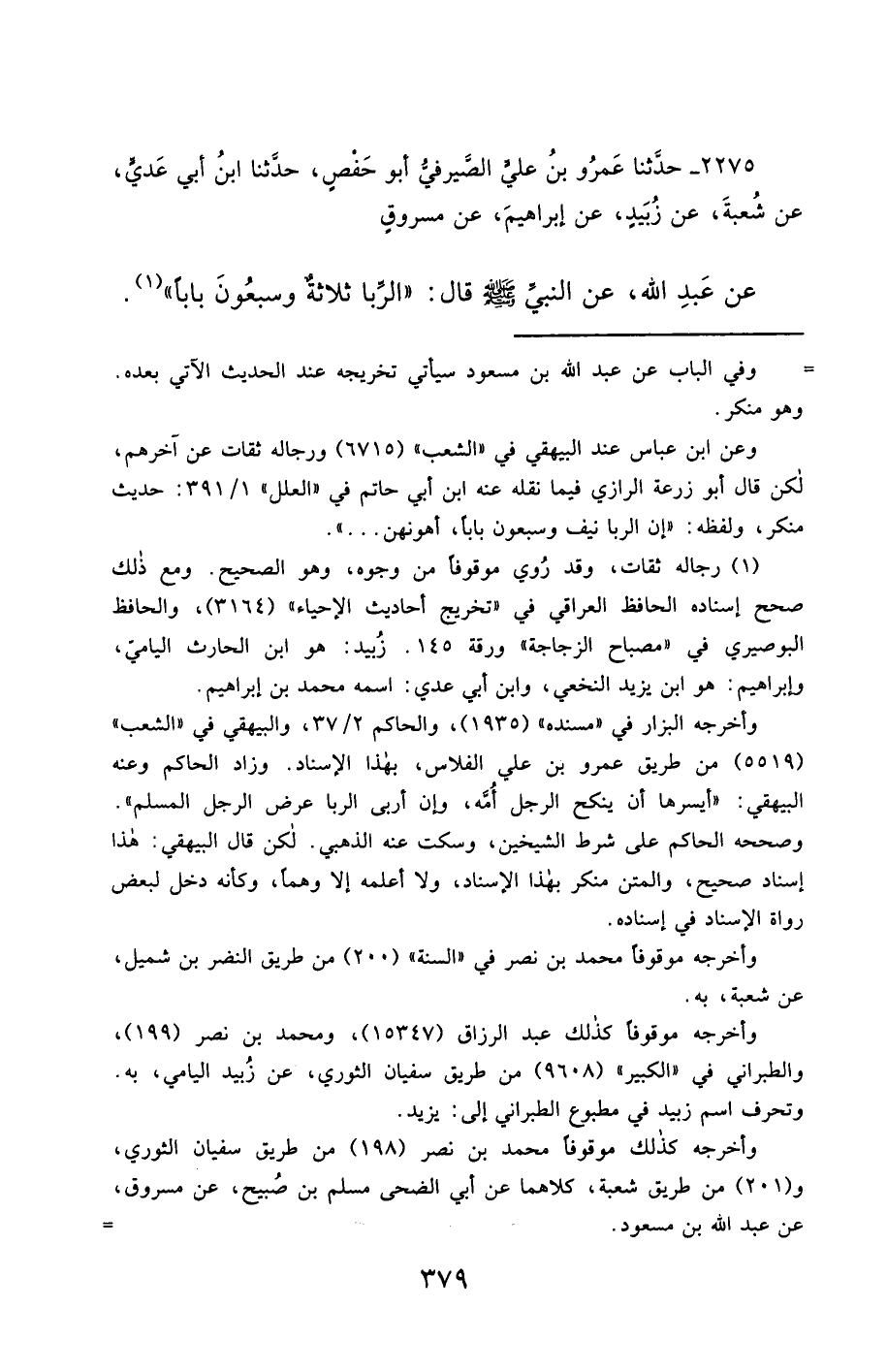 2275- حَدَّثَنَا عَمْرُو بْنُ عَلِيٍّ الصَّيْرَفِيُّ أَبُو حَفْصٍ ، حَدَّثَنَا ابْنُ أَبِي عَدِيٍّ ، عَنْ شُعْبَةَ ، عَنْ زُبَيْدٍ ، عَنْ إِبْرَاهِيمَ ، عَنْ مَسْرُوقٍ ، عَنْ عَبْدِ اللهِ ، عَنِ النَّبِيِّ صَلَّى الله عَليْهِ وسَلَّمَ قَالَ : الرِّبَا ثَلاَثَةٌ وَسَبْعُونَ بَابًا.