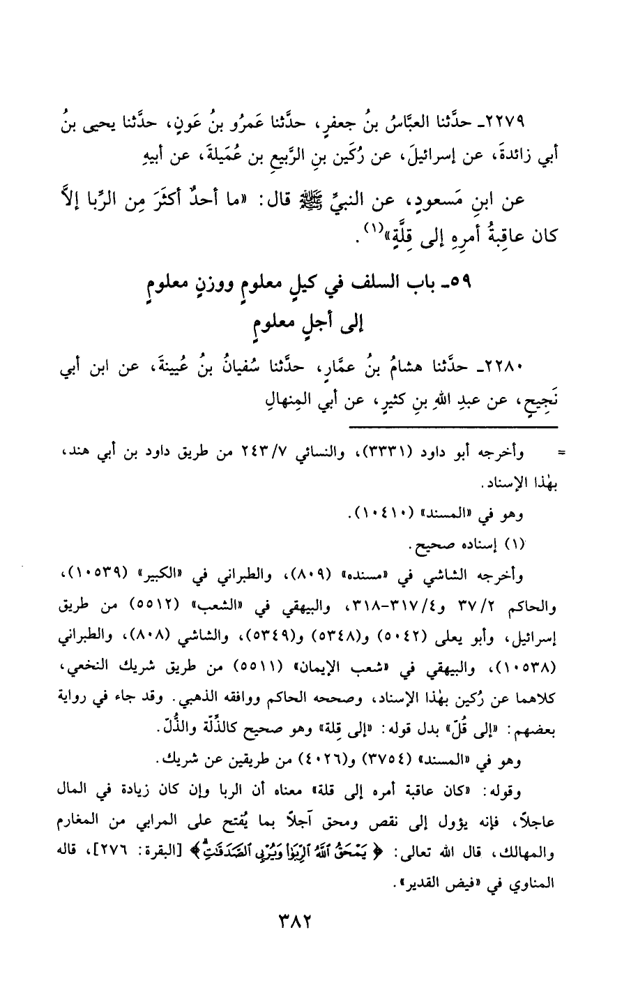 2279- حَدَّثَنَا الْعَبَّاسُ بْنُ جَعْفَرٍ ، حَدَّثَنَا عَمْرُو بْنُ عَوْنٍ ، حَدَّثَنَا يَحْيَى بْنُ أَبِي زَائِدَةَ ، عَنْ إِسْرَائِيلَ ، عَنِ رُكَيْنِ بْنِ الرَّبِيعِ بْنِ عُمَيْلَةَ ، عَنْ أَبِيهِ ، عَنِ ابْنِ مَسْعُودٍ ، عَنِ النَّبِيِّ صَلَّى الله عَليْهِ وسَلَّمَ قَالَ : مَا أَحَدٌ أَكْثَرَ مِنَ الرِّبَا ، إِلاَّ كَانَ عَاقِبَةُ أَمْرِهِ إِلَى قِلَّةٍ.