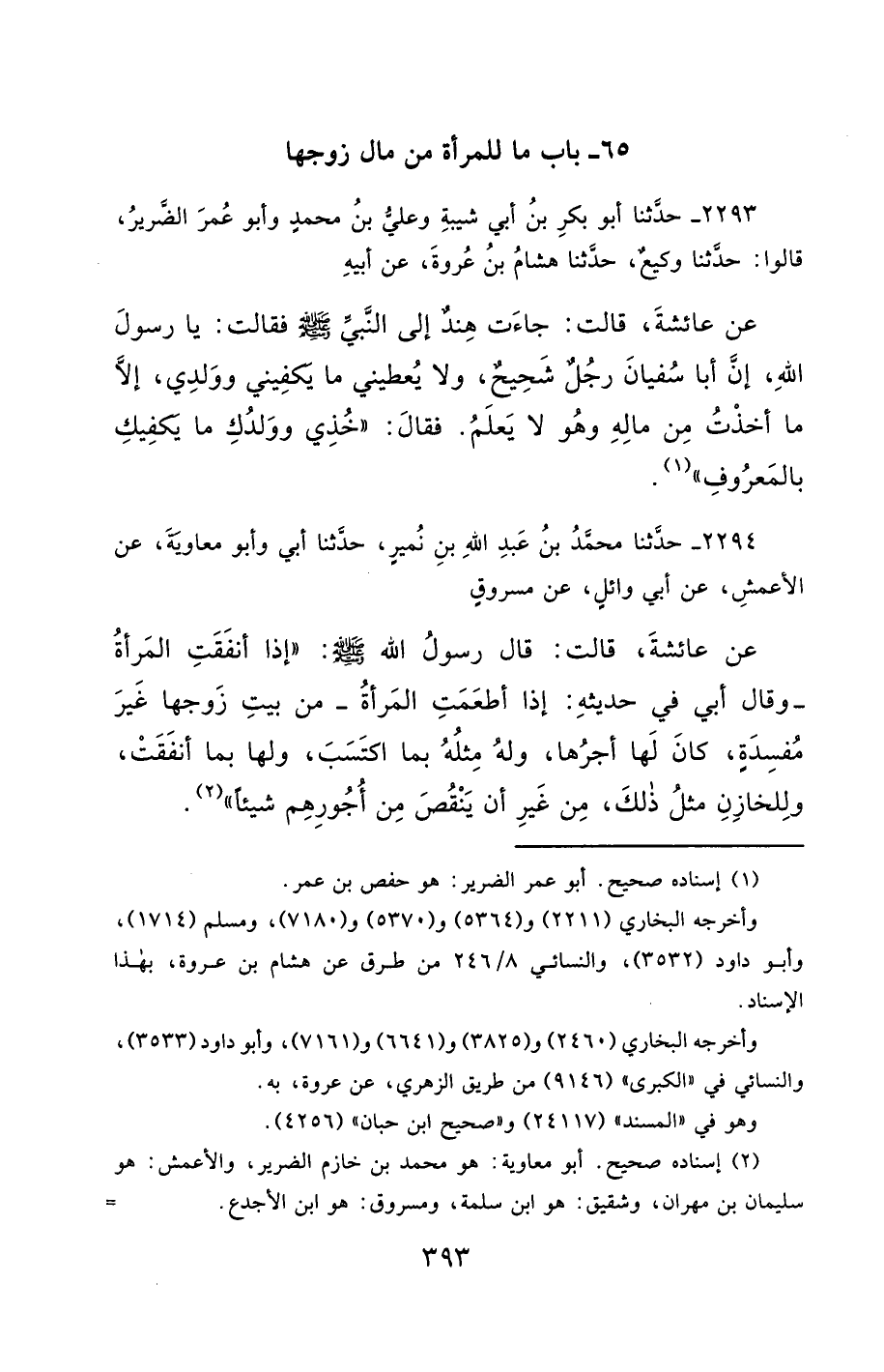 2293- حَدَّثَنَا أَبُو بَكْرِ بْنُ أَبِي شَيْبَةَ ، وَعَلِيُّ بْنُ مُحَمَّدٍ ، وَأَبُو عُمَرَ الضَّرِيرُ ، قَالُوا : حَدَّثَنَا وَكِيعٌ ، حَدَّثَنَا هِشَامُ بْنُ عُرْوَةَ ، عَنْ أَبِيهِ ، عَنْ عَائِشَةَ ، قَالَتْ : جَاءَتْ هِنْدٌ إِلَى النَّبِيِّ صَلَّى الله عَليْهِ وسَلَّمَ ، فَقَالَتْ : يَا رَسُولَ اللهِ ، إِنَّ أَبَا سُفْيَانَ رَجُلٌ شَحِيحٌ ، وَلاَ يُعْطِينِي مَا يَكْفِينِي وَوَلَدِي ، إِلاَّ مَا أَخَذْتُ مِنْ مَالِهِ ، وَهُوَ لاَ يَعْلَمُ ، فَقَالَ : خُذِي وَوَلَدَكِ مَا يَكْفِيكِ بِالْمَعْرُوفِ.