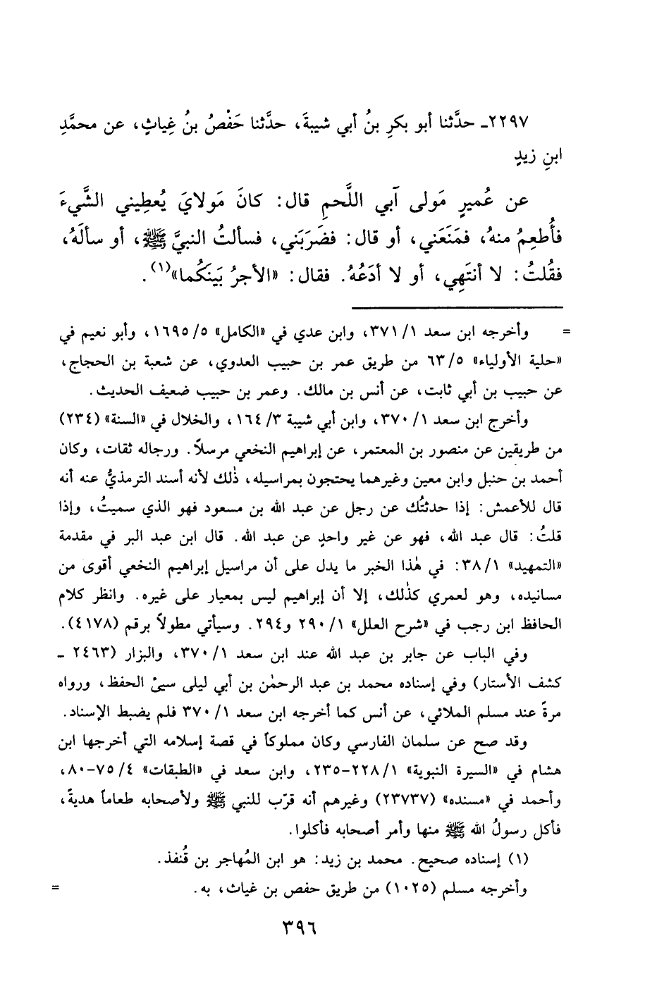 2297- حَدَّثَنَا أَبُو بَكْرِ بْنُ أَبِي شَيْبَةَ ، حَدَّثَنَا حَفْصُ بْنُ غِيَاثٍ ، عَنْ مُحَمَّدِ بْنِ زَيْدٍ ، عَنْ عُمَيْرٍ ، مَوْلَى آبِي اللَّحْمِ ، قَالَ : كَانَ مَوْلاَيَ يُعْطِينِي الشَّيْءَ فَأُطْعِمُ مِنْهُ ، فَمَنَعَنِي ، أَوْ قَالَ : فَضَرَبَنِي ، فَسَأَلْتُ النَّبِيَّ صَلَّى الله عَليْهِ وسَلَّمَ ، أَوْ سَأَلَهُ ، فَقُلْتُ : لاَ أَنْتَهِي أَوْ لاَ أَدَعُهُ ، فَقَالَ : الأَجْرُ بَيْنَكُمَا.