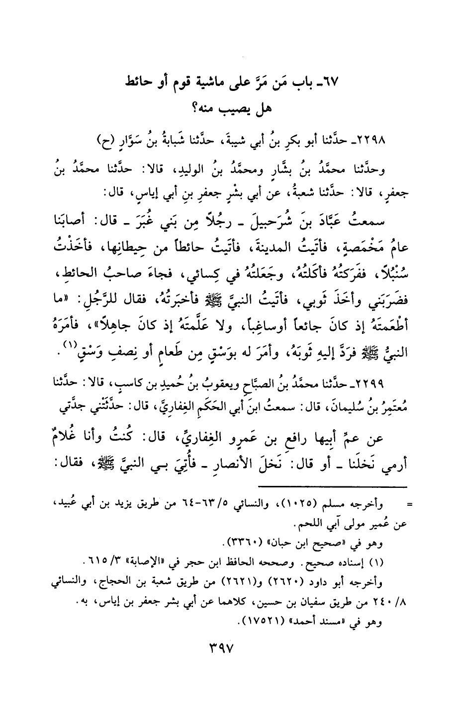2298- حَدَّثَنَا أَبُو بَكْرِ بْنُ أَبِي شَيْبَةَ ، حَدَّثَنَا شَبَابَةُ بْنُ سَوَّارٍ (ح) وحَدَّثَنَا مُحَمَّدُ بْنُ بَشَّارٍ ، وَمُحَمَّدُ بْنُ الْوَلِيدِ ، قَالاَ : حَدَّثَنَا مُحَمَّدُ بْنُ جَعْفَرٍ ، ءءء انظر الكتاب , حَدَّثَنَا شُعْبَةُ ، عَنْ أَبِي بِشْرٍ جَعْفَرِ بْنِ إِيَاسٍ ، قَالَ : سَمِعْتُ عَبَّادَ بْنَ شُرَحْبِيلَ ، رَجُلاً مِنْ بَنِي غُبَرَ ، قَالَ : أَصَابَنَا عَامُ مَخْمَصَةٍ ، فَأَتَيْتُ الْمَدِينَةَ ، فَأَتَيْتُ حَائِطًا مِنْ حِيطَانِهَا ، فَأَخَذْتُ سُنْبُلاً فَفَرَكْتُهُ فَأَكَلْتُهُ ، وَجَعَلْتُهُ فِي كِسَائِي ، فَجَاءَ صَاحِبُ الْحَائِطِ ، فَضَرَبَنِي وَأَخَذَ ثَوْبِي ، فَأَتَيْتُ النَّبِيَّ صَلَّى الله عَليْهِ وسَلَّمَ ، فَأَخْبَرْتُهُ ، فَقَالَ لِلرَّجُلِ مَا أَطْعَمْتَهُ إِذْ كَانَ جَائِعًا ، أَوْ سَاغِبًا ، وَلاَ عَلَّمْتَهُ إِذْ كَانَ جَاهِلاً ، فَأَمَرَهُ النَّبِيُّ صَلَّى الله عَليْهِ وسَلَّمَ ، فَرَدَّ إِلَيْهِ ثَوْبَهُ ، وَأَمَرَ لَهُ بِوَسْقٍ مِنْ طَعَامٍ ، أَوْ نِصْفِ وَسْقٍ.