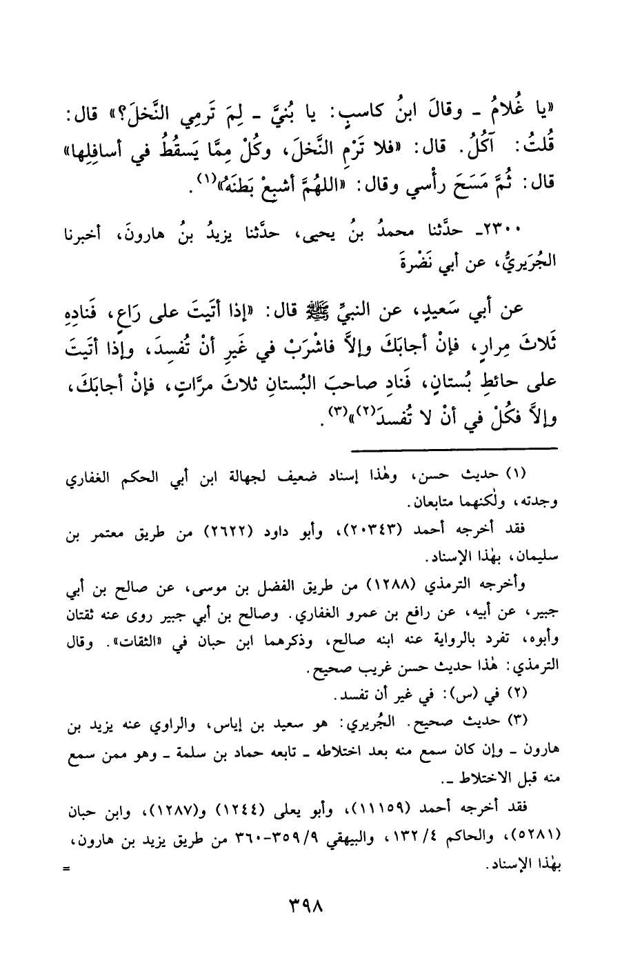2300- حَدَّثَنَا مُحَمَّدُ بْنُ يَحْيَى ، حَدَّثَنَا يَزِيدُ بْنُ هَارُونَ ، أَخْبَرَنَا الْجُرَيْرِيُّ ، عَنْ أَبِي نَضْرَةَ ، عَنْ أَبِي سَعِيدٍ ، عَنِ النَّبِيِّ صَلَّى الله عَليْهِ وسَلَّمَ قَالَ : إِذَا أَتَيْتَ عَلَى رَاعٍ ، فَنَادِهِ ثَلاَثَ مِرَارٍ ، فَإِنْ أَجَابَكَ ، وَإِلاَّ فَاشْرَبْ فِي غَيْرِ أَنْ تُفْسِدَ ، وَإِذَا أَتَيْتَ عَلَى حَائِطِ بُسْتَانٍ ، فَنَادِ صَاحِبَ الْبُسْتَانِ ثَلاَثَ مَرَّاتٍ ، فَإِنْ أَجَابَكَ ، وَإِلاَّ فَكُلْ فِي أَنْ لاَ تُفْسِدَ.