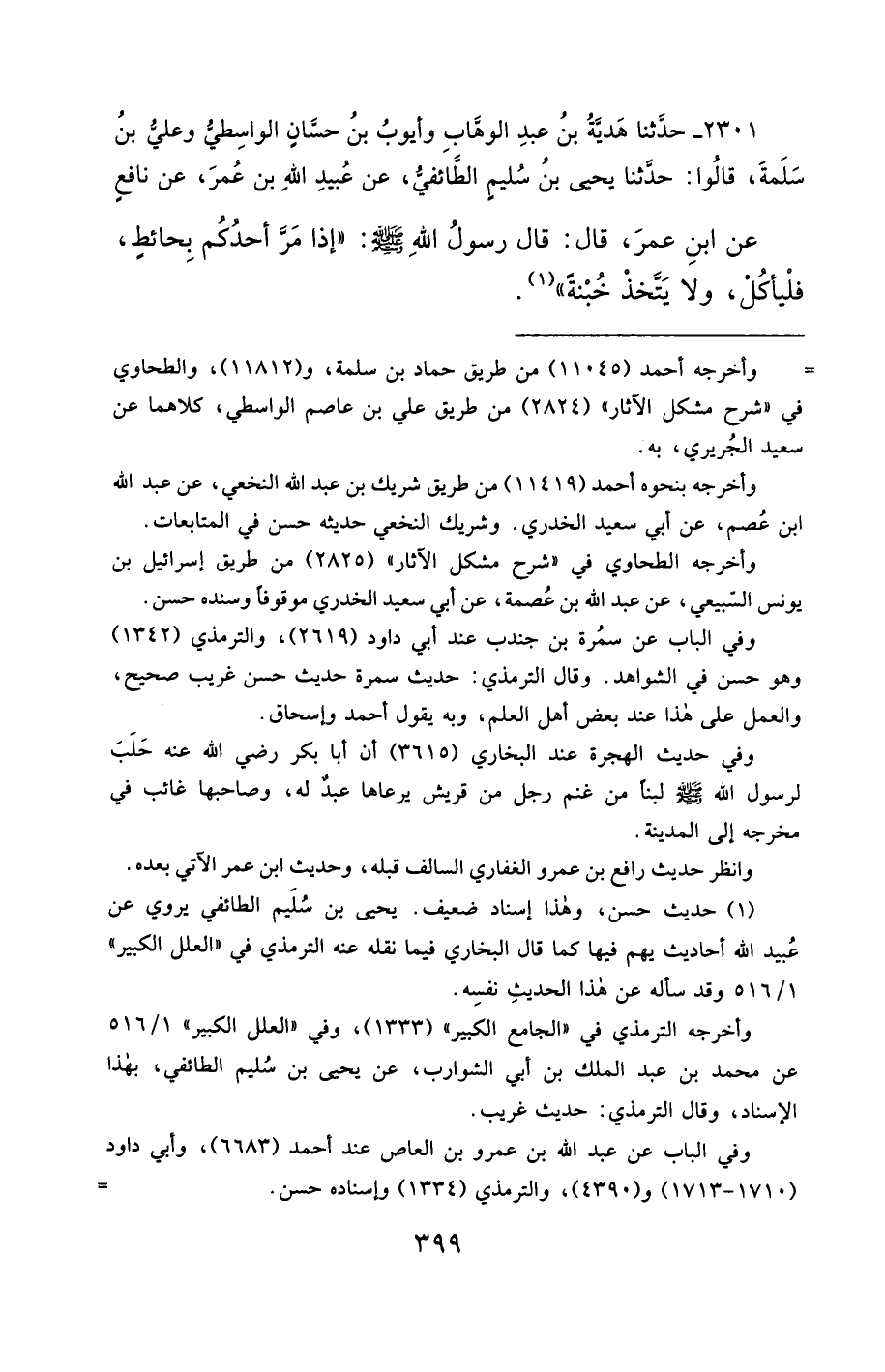 2301- حَدَّثَنَا هَدِيَّةُ بْنُ عَبْدِ الْوَهَّابِ ، وَأَيُّوبُ بْنُ حَسَّانَ الْوَاسِطِيُّ ، وَعَلِيُّ بْنُ سَلَمَةَ ، قَالُوا : حَدَّثَنَا يَحْيَى بْنُ سُلَيْمٍ الطَّائِفِيُّ ، عَنْ عُبَيْدِ اللهِ بْنِ عُمَرَ ، عَنْ نَافِعٍ ، عَنِ ابْنِ عُمَرَ ، قَالَ : قَالَ رَسُولُ اللهِ صَلَّى الله عَليْهِ وسَلَّمَ : إِذَا مَرَّ أَحَدُكُمْ بِحَائِطٍ فَلْيَأْكُلْ ، وَلاَ يَتَّخِذْ خُبْنَةً.