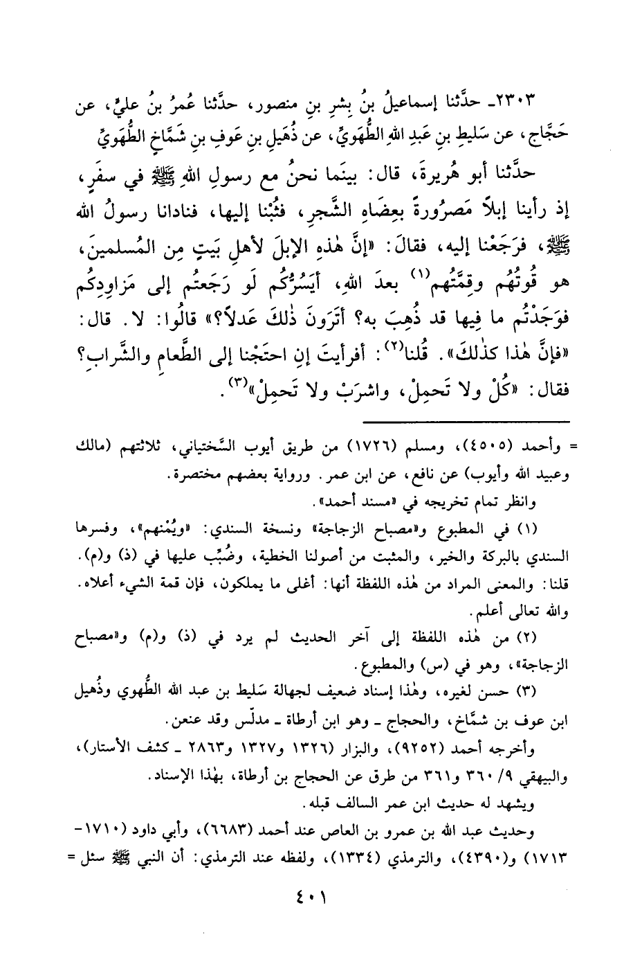 2303- حَدَّثَنَا إِسْمَاعِيلُ بْنُ بِشْرِ بْنِ مَنْصُورٍ ، حَدَّثَنَا عُمَرُ بْنُ عَلِيٍّ ، عَنْ حَجَّاجٍ ، عَنْ سَلِيطِ بْنِ عَبْدِ اللهِ الطُّهَوِيِّ ، عَنْ ذُهَيْلِ بْنِ عَوْفِ بْنِ شَمَّاخٍ الطُّهَوِيِّ ، حَدَّثَنَا أَبُو هُرَيْرَةَ ، قَالَ : بَيْنَمَا نَحْنُ مَعَ رَسُولِ اللهِ صَلَّى الله عَليْهِ وسَلَّمَ فِي سَفَرٍ ، إِذْ رَأَيْنَا إِبِلاً مَصْرُورَةً بِعِضَاهِ الشَّجَرِ ، فَثُبْنَا إِلَيْهَا ، فَنَادَانَا رَسُولُ اللهِ صَلَّى الله عَليْهِ وسَلَّمَ ، فَرَجَعْنَا إِلَيْهِ ، فَقَالَ : إِنَّ هَذِهِ الإِبِلَ لأَهْلِ بَيْتٍ مِنَ الْمُسْلِمِينَ هُوَ قُوتُهُمْ ، وَقِمَّتُهُمْ بَعْدَ اللهِ ، أَيَسُرُّكُمْ لَوْ رَجَعْتُمْ إِلَى مَزَاوِدِكُمْ فَوَجَدْتُمْ مَا فِيهَا قَدْ ذُهِبَ بِهِ , أَتُرَوْنَ ذَلِكَ عَدْلاً ؟ قَالُوا : لاَ ، قَالَ : فَإِنَّ هَذَا كَذَلِكَ ، قُلْنَا : أَفَرَأَيْتَ إِنِ احْتَجْنَا إِلَى الطَّعَامِ وَالشَّرَابِ ؟ فَقَالَ : كُلْ وَلاَ تَحْمِلْ ، وَاشْرَبْ وَلاَ تَحْمِلْ.