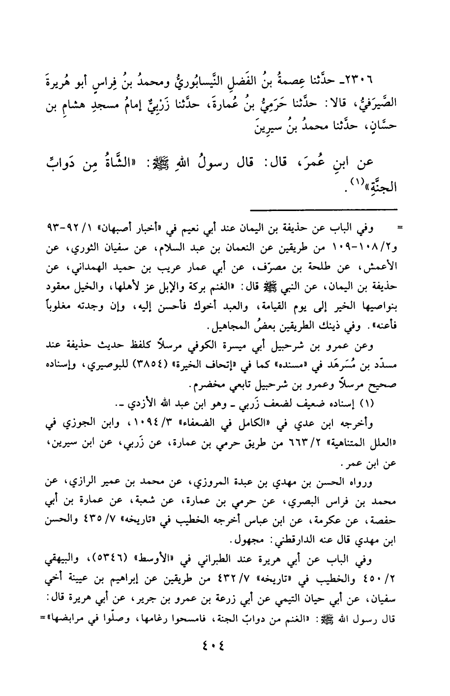 2306- حَدَّثَنَا عِصْمَةُ بْنُ الْفَضْلِ النَّيْسَابُورِيُّ ، وَمُحَمَّدُ بْنُ فِرَاسٍ أَبُو هُرَيْرَةَ الصَّيْرَفِيُّ ، قَالاَ : حَدَّثَنَا حَرَمِيُّ بْنُ عُمَارَةَ ، حَدَّثَنَا زَرْبِيٌّ ، إِمَامُ مَسْجِدِ هِشَامِ بْنِ حَسَّانٍ ، حَدَّثَنَا مُحَمَّدُ بْنُ سِيرِينَ ، عَنِ ابْنِ عُمَرَ ، قَالَ : قَالَ رَسُولُ اللهِ صَلَّى الله عَليْهِ وسَلَّمَ : الشَّاةُ مِنْ دَوَابِّ الْجَنَّةِ.
