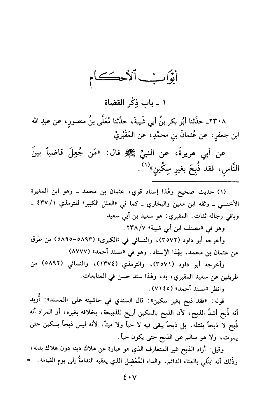 2308- حَدَّثَنَا أَبُو بَكْرِ بْنُ أَبِي شَيْبَةَ ، حَدَّثَنَا مُعَلَّى بْنُ مَنْصُورٍ ، عَنْ عَبْدِ اللهِ بْنِ جَعْفَرٍ ، عَنْ عُثْمَانَ بْنِ مُحَمَّدٍ ، عَنِ الْمَقْبُريِّ ، عَنْ أَبِي هُرَيْرَةَ ، عَنِ النَّبِيِّ صَلَّى الله عَليْهِ وسَلَّمَ ، قَالَ : مَنْ جُعِلَ قَاضِيًا بَيْنَ النَّاسِ ، فَقَدْ ذُبِحَ بِغَيْرِ سِكِّينٍ.