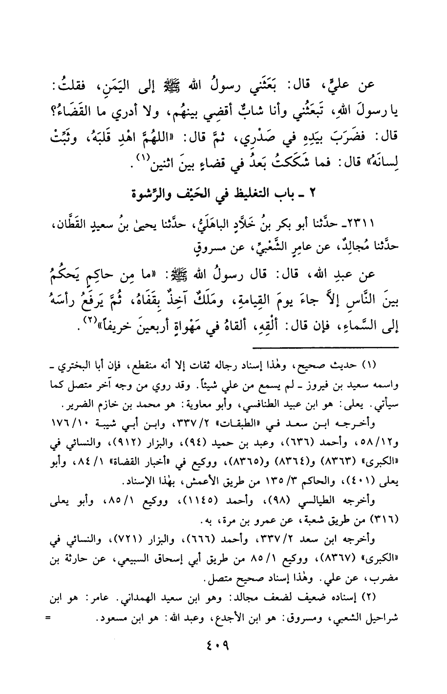 2311- حَدَّثَنَا أَبُو بَكْرِ بْنُ خَلاَّدٍ الْبَاهِلِيُّ ، حَدَّثَنَا يَحْيَى بْنُ سَعِيدٍ الْقَطَّانُ ، حَدَّثَنَا مُجَالِدٌ ، عَنْ عَامِرٍ الشَّعْبِيِّ ، عَنْ مَسْرُوقٍ ، عَنْ عَبْدِ اللهِ ، قَالَ : قَالَ رَسُولُ اللهِ صَلَّى الله عَليْهِ وسَلَّمَ : مَا مِنْ حَاكِمٍ يَحْكُمُ بَيْنَ النَّاسِ , إِلاَّ جَاءَ يَوْمَ الْقِيَامَةِ وَمَلَكٌ آخِذٌ بِقَفَاهُ ، ثُمَّ يَرْفَعُ رَأْسَهُ إِلَى السَّمَاءِ ، فَإِنْ قَالَ : أَلْقِهِ ، أَلْقَاهُ فِي مَهْوَاةٍ أَرْبَعِينَ خَرِيفًا.