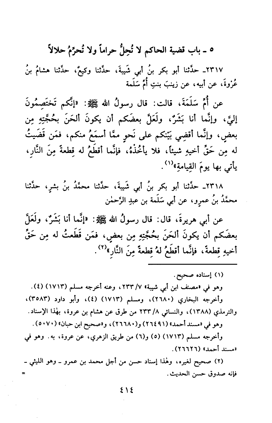 2317- حَدَّثَنَا أَبُو بَكْرِ بْنُ أَبِي شَيْبَةَ ، حَدَّثَنَا وَكِيعٌ ، حَدَّثَنَا هِشَامُ بْنُ عُرْوَةَ ، عَنْ أَبِيهِ ، عَنْ زَيْنَبَ بِنْتِ أُمِّ سَلَمَةَ ، عَنْ أُمِّ سَلَمَةَ ، قَالَتْ : قَالَ رَسُولُ اللهِ صَلَّى الله عَليْهِ وسَلَّمَ : إِنَّكُمْ تَخْتَصِمُونَ إِلَيَّ , وَإِنَّمَا أَنَا بَشَرٌ ، وَلَعَلَّ بَعْضَكُمْ أَنْ يَكُونَ أَلْحَنَ بِحُجَّتِهِ مِنْ بَعْضٍ ، وَإِنَّمَا أَقْضِي بَيْنَكُمْ عَلَى نَحْوٍ مِمَّا أَسْمَعُ مِنْكُمْ ، فَمَنْ قَضَيْتُ لَهُ مِنْ حَقِّ أَخِيهِ شَيْئًا ، فَلاَ يَأْخُذْهُ , فَإِنَّمَا أَقْطَعُ لَهُ قِطْعَةً مِنَ النَّارِ ، يَأْتِي بِهَا يَوْمَ الْقِيَامَةِ.
