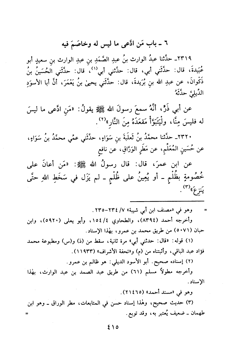 2319- حَدَّثَنَا عَبْدُ الْوَارِثِ بْنُ عَبْدِ الصَّمَدِ بْنِ عَبْدِ الْوَارِثِ بْنِ سَعِيدٍ أَبُو عُبَيْدَةَ , قَالَ : حَدَّثَنِي أَبِي ، قَالَ : حَدَّثَنِي أَبِي ، قَالَ : حَدَّثَنِي الْحُسَيْنُ بْنُ ذَكْوَانَ ، عَنْ عَبْدِ اللهِ بْنِ بُرَيْدَةَ ، قَالَ : حَدَّثَنِي يَحْيَى بْنُ يَعْمَُرَ ، أَنَّ أَبَا الأَسْوَدِ الدِّيلِيَّ حَدَّثَهُ عَنْ أَبِي ذَرٍّ ، أَنَّهُ سَمِعَ رَسُولَ اللهِ صَلَّى الله عَليْهِ وسَلَّمَ يَقُولُ : مَنِ ادَّعَى مَا لَيْسَ لَهُ فَلَيْسَ مِنَّا ، وَلْيَتَبَوَّأْ مَقْعَدَهُ مِنَ النَّارِ.