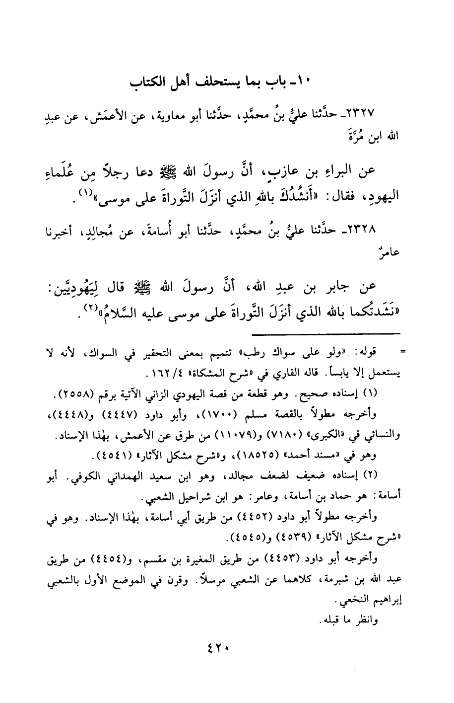 2328- حَدَّثَنَا عَلِيُّ بْنُ مُحَمَّدٍ ، حَدَّثَنَا أَبُو أُسَامَةَ ، عَنْ مُجَالِدٍ ، أَخْبَرَنَا عَامِرٌ ، عَنْ جَابِرِ بْنِ عَبْدِ اللهِ ، أَنَّ رَسُولَ اللهِ صَلَّى الله عَليْهِ وسَلَّمَ قَالَ لِيَهُودِيَّيْنِ : نَشَدْتُكُمَا بِاللَّهِ الَّذِي أَنْزَلَ التَّوْرَاةَ عَلَى مُوسَى عَلَيْهِ السَّلاَمُ.
