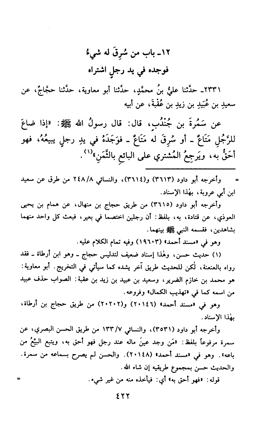 2331- حَدَّثَنَا عَلِيُّ بْنُ مُحَمَّدٍ ، حَدَّثَنَا أَبُو مُعَاوِيَةَ ، حَدَّثَنَا حَجَّاجٌ ، عَنْ سَعِيدِ بْنِ عُبَيْدِ بْنِ زَيْدِ بْنِ عُقْبَةَ ، عَنْ أَبِيهِ ، عَنْ سَمُرَةَ بْنِ جُنْدُبٍ ، قَالَ : قَالَ رَسُولُ اللهِ صَلَّى الله عَليْهِ وسَلَّمَ : إِذَا ضَاعَ لِلرَّجُلِ مَتَاعٌ ، أَوْ سُرِقَ لَهُ مَتَاعٌ ، فَوَجَدَهُ فِي يَدِ رَجُلٍ يَبِيعُهُ ، فَهُوَ أَحَقُّ بِهِ ، وَيَرْجِعُ الْمُشْتَرِي عَلَى الْبَائِعِ بِالثَّمَنِ.