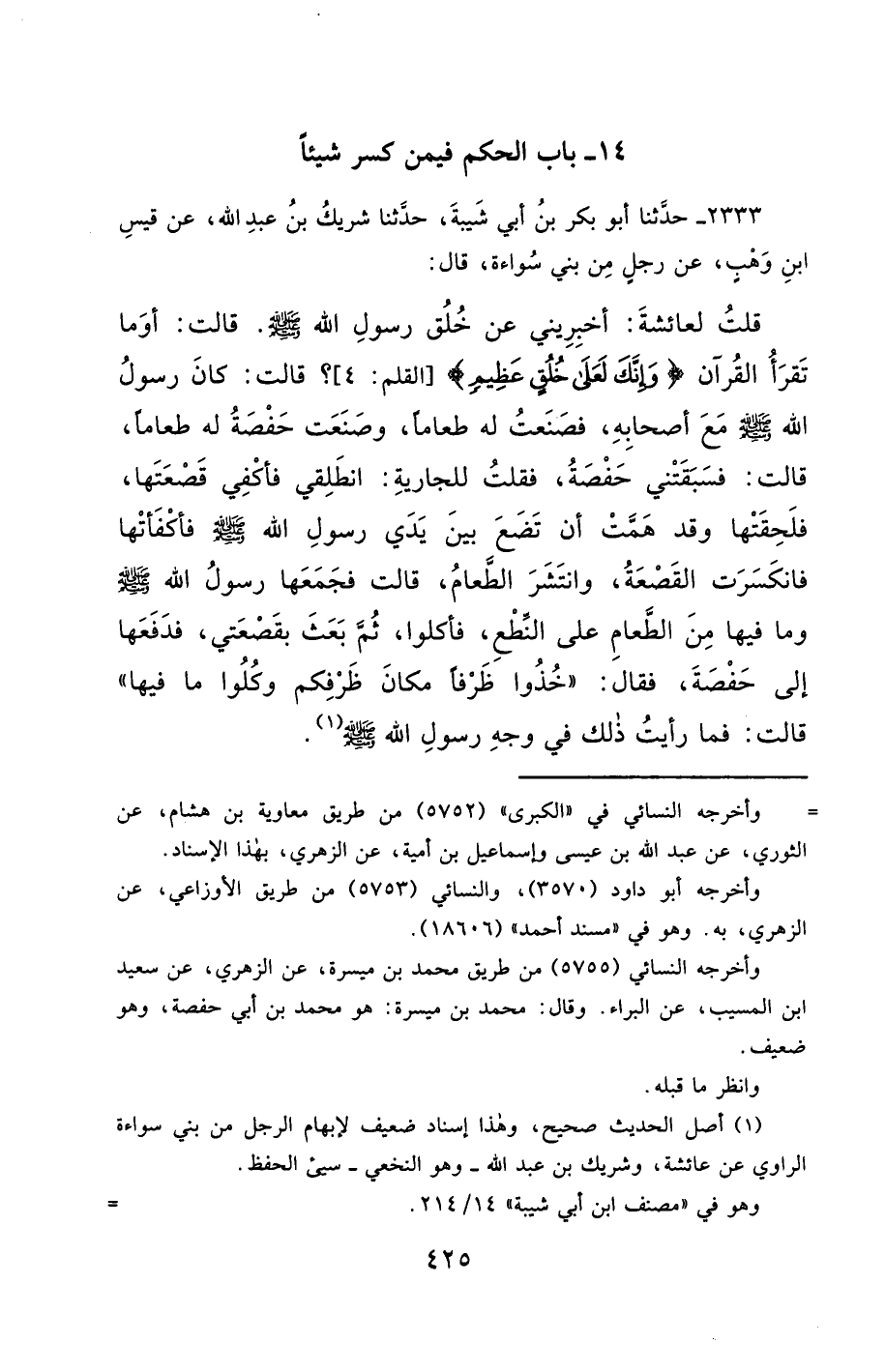 2333- حَدَّثَنَا أَبُو بَكْرِ بْنُ أَبِي شَيْبَةَ ، حَدَّثَنَا شَرِيكُ بْنُ عَبْدِ اللهِ ، عَنْ قَيْسِ بْنِ وَهْبٍ ، عَنْ رَجُلٍ مِنْ بَنِي سُوَاءَةَ ، قَالَ : قُلْتُ لِعَائِشَةَ : أَخْبِرِينِي عَنْ خُلُقِ رَسُولِ اللهِ صَلَّى الله عَليْهِ وسَلَّمَ ، قَالَتْ : أَوَمَا تَقْرَأُ الْقُرْآنَ : {وَإِنَّكَ لَعَلَى خُلُقٍ عَظِيمٍ} ؟ قَالَتْ : كَانَ رَسُولُ اللهِ صَلَّى الله عَليْهِ وسَلَّمَ مَعَ أَصْحَابِهِ ، فَصَنَعْتُ لَهُ طَعَامًا ، وَصَنَعَتْ حَفْصَةُ لَهُ طَعَامًا ، قَالَتْ : فَسَبَقَتْنِي حَفْصَةُ ، فَقُلْتُ لِلْجَارِيَةِ : انْطَلِقِي , فَأَكْفِئِي قَصْعَتَهَا ، فَلَحِقَتْهَا ، وَقَدْ هَمَّتْ أَنْ تَضَعَ بَيْنَ يَدَيْ رَسُولِ اللهِ صَلَّى الله عَليْهِ وسَلَّمَ ، فَأَكْفَأَتْهَا , فَانْكَسَرَتِ الْقَصْعَةُ ، وَانْتَشَرَ الطَّعَامُ ، قَالَتْ : فَجَمَعَهَا رَسُولُ اللهِ صَلَّى الله عَليْهِ وسَلَّمَ وَمَا فِيهَا مِنَ الطَّعَامِ عَلَى النِّطْعِ ، فَأَكَلُوا ، ثُمَّ بَعَثَ بِقَصْعَتِي ، فَدَفَعَهَا إِلَى حَفْصَةَ ، فَقَالَ : خُذُوا ظَرْفًا مَكَانَ ظَرْفِكُمْ ، وَكُلُوا مَا فِيهَا ، قَالَتْ : فَمَا رَأَيْتُ ذَلِكَ فِي وَجْهِ رَسُولِ اللهِ صَلَّى الله عَليْهِ وسَلَّمَ.