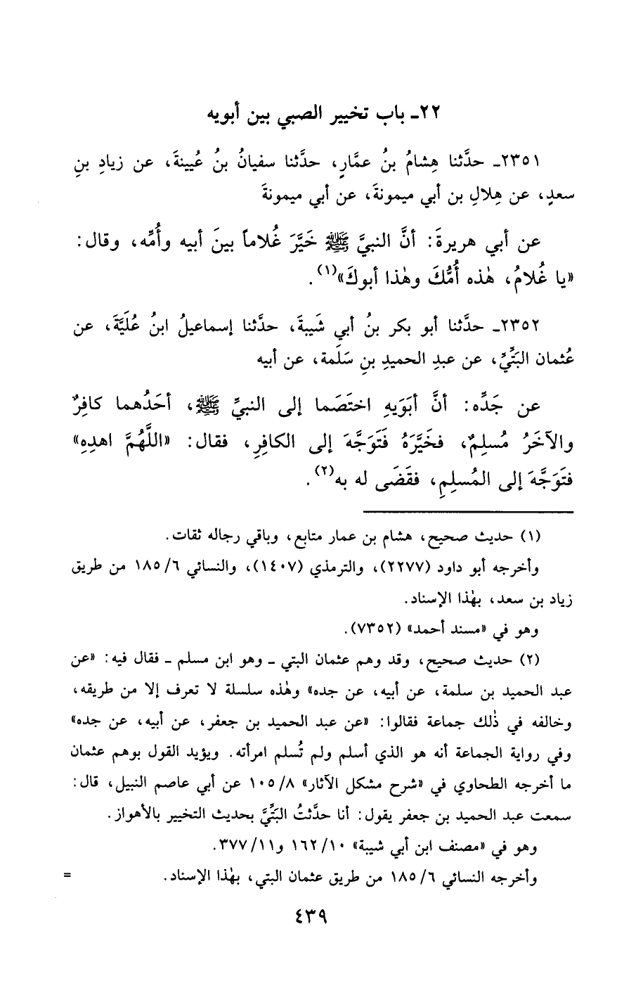 2352- حَدَّثَنَا أَبُو بَكْرِ بْنُ أَبِي شَيْبَةَ ، حَدَّثَنَا إِسْمَاعِيلُ ابْنُ عُلَيَّةَ ، عَنْ عُثْمَانَ الْبَتِّيِّ ، عَنْ عَبْدِ الْحَمِيدِ بْنِ سَلَمَةَ ، عَنْ أَبِيهِ ، عَنْ جَدِّهِ ، أَنَّ أَبَوَيْهِ اخْتَصَمَا إِلَى النَّبِيِّ صَلَّى الله عَليْهِ وسَلَّمَ ، أَحَدُهُمَا كَافِرٌ , وَالآخَرُ مُسْلِمٌ ، فَخَيَّرَهُ فَتَوَجَّهَ إِلَى الْكَافِرِ ، فَقَالَ : اللَّهُمَّ اهْدِهِ ، فَتَوَجَّهَ إِلَى الْمُسْلِمِ ، فَقَضَى لَهُ بِهِ.