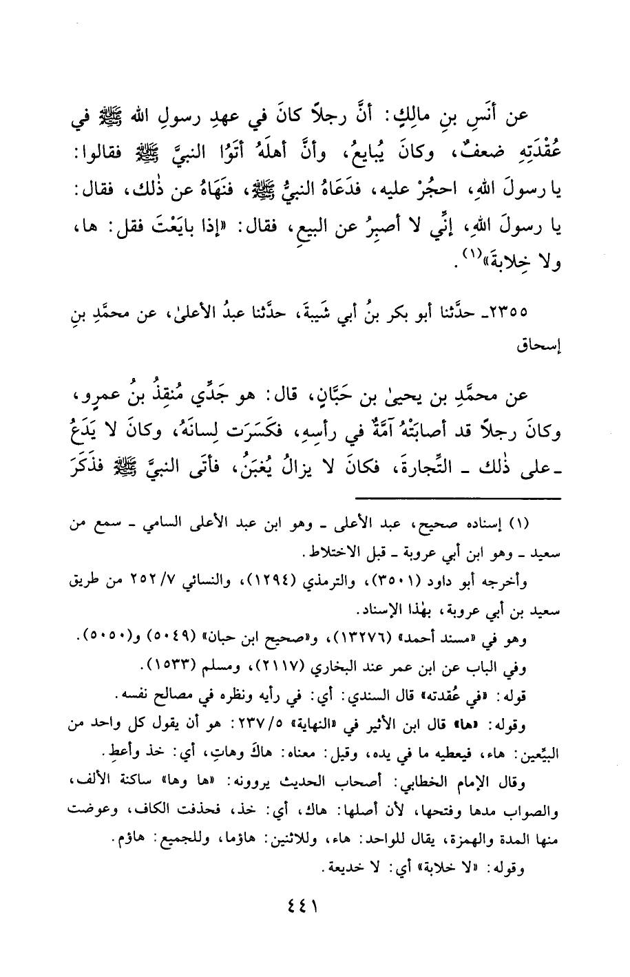2355- حَدَّثَنَا أَبُو بَكْرِ بْنُ أَبِي شَيْبَةَ ، حَدَّثَنَا عَبْدُ الأَعْلَى ، عَنْ مُحَمَّدِ بْنِ إِسْحَاقَ ، عَنْ مُحَمَّدِ بْنِ يَحْيَى بْنِ حَبَّانٍ ، قَالَ : هُوَ جَدِّي مُنْقِذُ بْنُ عَمْرٍو , وَكَانَ رَجُلاً قَدْ أَصَابَتْهُ آمَّةٌ فِي رَأْسِهِ , فَكَسَرَتْ لِسَانَهُ ، وَكَانَ لاَ يَدَعُ عَلَى ذَلِكَ التِّجَارَةَ ، فَكَانَ لاَ يَزَالُ يُغْبَنُ ، فَأَتَى النَّبِيَّ صَلَّى الله عَليْهِ وسَلَّمَ ، فَذَكَرَ ذَلِكَ لَهُ , فَقَالَ لَهُ : إِذَا أَنْتَ بَايَعْتَ ، فَقُلْ : لاَ خِلاَبَةَ ، ثُمَّ أَنْتَ فِي كُلِّ سِلْعَةٍ ابْتَعْتَهَا بِالْخِيَارِ ثَلاَثَ لَيَالٍ ، فَإِنْ رَضِيتَ فَأَمْسِكْ ، وَإِنْ سَخِطْتَ فَارْدُدْهَا عَلَى صَاحِبِهَا.