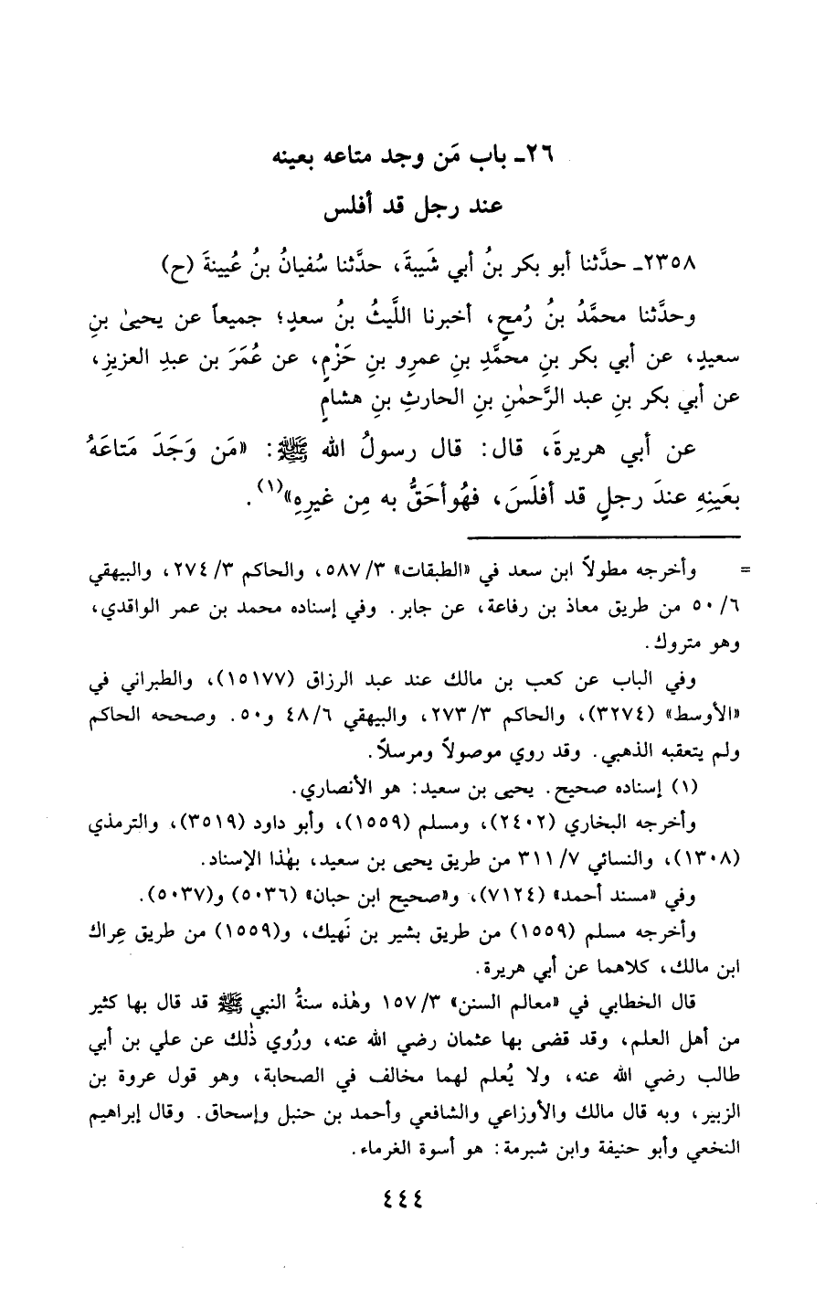 2358- حَدَّثَنَا أَبُو بَكْرِ بْنُ أَبِي شَيْبَةَ ، حَدَّثَنَا سُفْيَانُ بْنُ عُيَيْنَةَ (ح) وحَدَّثَنَا مُحَمَّدُ بْنُ رُمْحٍ ، أَخْبَرَنَا اللَّيْثُ بْنُ سَعْدٍ ؛ جَمِيعًا عَنْ يَحْيَى بْنِ سَعِيدٍ ، عَنْ أَبِي بَكْرِ بْنِ مُحَمَّدِ بْنِ عَمْرِو بْنِ حَزْمٍ ، عَنْ عُمَرَ بْنِ عَبْدِ الْعَزِيزِ ، عَنْ أَبِي بَكْرِ بْنِ عَبْدِ الرَّحْمَنِ بْنِ الْحَارِثِ بْنِ هِشَامٍ ، عَنْ أَبِي هُرَيْرَةَ ، قَالَ : قَالَ رَسُولُ اللهِ صَلَّى الله عَليْهِ وسَلَّمَ : مَنْ وَجَدَ مَتَاعَهُ بِعَيْنِهِ عِنْدَ رَجُلٍ قَدْ أَفْلَسَ ، فَهُوَ أَحَقُّ بِهِ مِنْ غَيْرِهِ.
