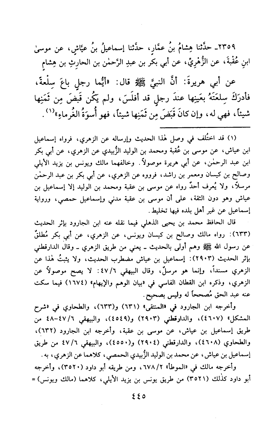 2359- حَدَّثَنَا هِشَامُ بْنُ عَمَّارٍ ، حَدَّثَنَا إِسْمَاعِيلُ بْنُ عَيَّاشٍ ، عَنْ مُوسَى بْنِ عُقْبَةَ ، عَنِ الزُّهْرِيِّ ، عَنْ أَبِي بَكْرِ بْنِ عَبْدِ الرَّحْمَنِ بْنِ الْحَارِثِ بْنِ هِشَامٍ ، عَنْ أَبِي هُرَيْرَةَ ، أَنَّ النَّبِيَّ صَلَّى الله عَليْهِ وسَلَّمَ قَالَ : أَيُّمَا رَجُلٍ بَاعَ سِلْعَةً ، فَأَدْرَكَ سِلْعَتَهُ بِعَيْنِهَا عِنْدَ رَجُلٍ قَدْ أَفْلَسَ ، وَلَمْ يَكُنْ قَبَضَ مِنْ ثَمَنِهَا شَيْئًا ، فَهِيَ لَهُ ، وَإِنْ كَانَ قَبَضَ مِنْ ثَمَنِهَا شَيْئًا ، فَهُوَ أُسْوَةُ الْغُرَمَاءِ.