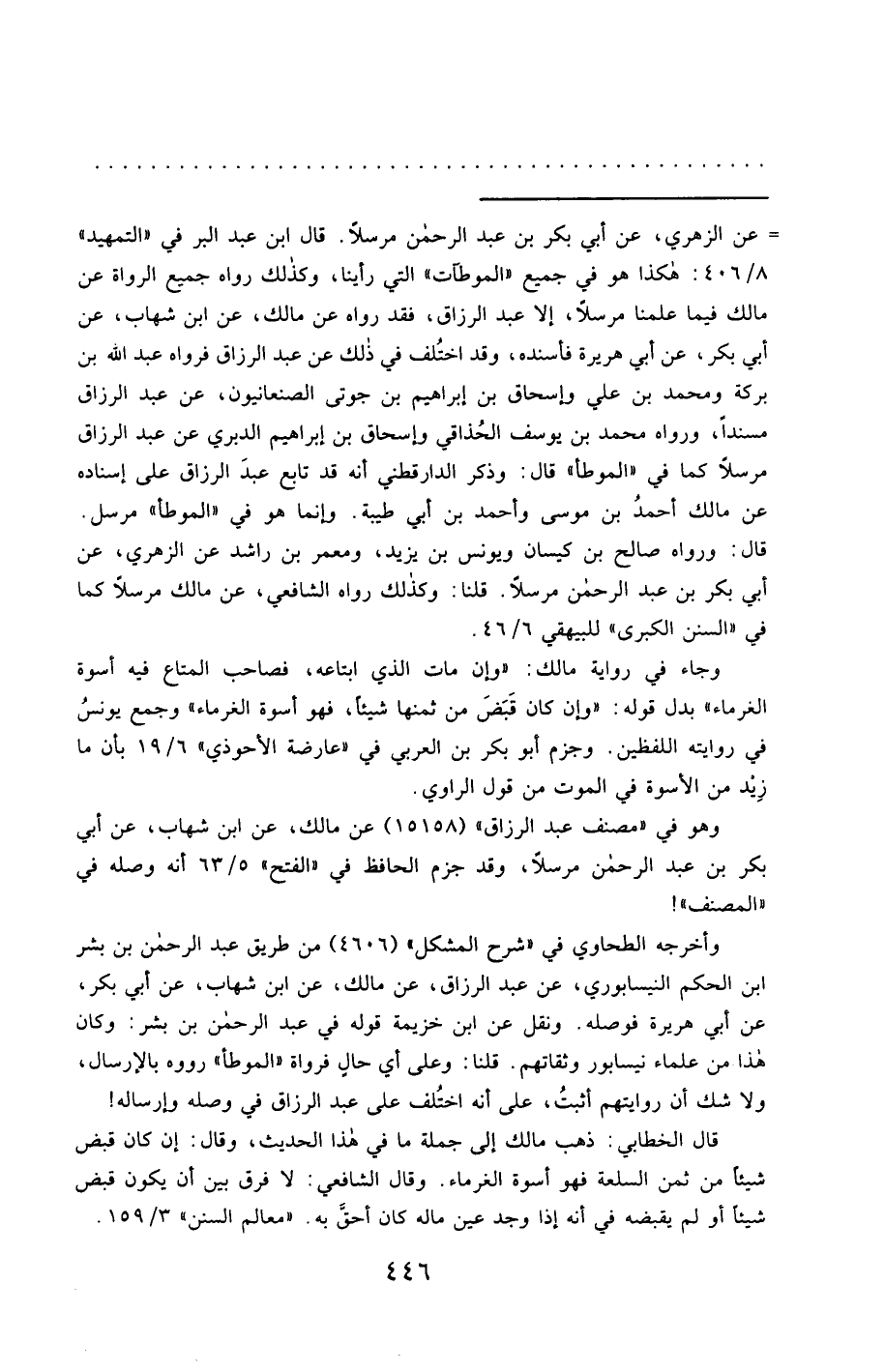 = عن الزهري، عن أبي بكر بن عبد الرحمن مرسلًا. قال ابن عبد البر في "التمهيد" 8/ 406: هكذا هو في جميع "الموطآت" التي رأينا، وكذلك رواه جميع الرواة عن مالك فيما علمنا مرسلًا، إلا عبد الرزاق، فقد رواه عن مالك، عن ابن شهاب، عن أبي بكر، عن أبي هريرة فأسنده، وقد اختُلف في ذلك عن عبد الرزاق فرواه عبد الله بن بركة ومحمد بن علي وإسحاق بن إبراهيم بن جوتى الصنعانيون، عن عبد الرزاق مسندًا، ورواه محمَّد بن يوسف الحُذاقي وإسحاق بن إبراهيم الدبري عن عبد الرزاق مرسلًا كما في "الموطأ" قال: وذكر الدارقطني أنه قد تابع عبدَ الرزاق على إسناده عن مالك أحمدُ بن موسى وأحمد بن أبي طيبة. وإنما هو في "الموطأ" مرسل. قال: ورواه صالح بن كيسان ويونس بن يزيد، ومعمر بن راشد عن الزهري، عن أبي بكر بن عبد الرحمن مرسلًا. قلنا: وكذلك رواه الشافعي، عن مالك مرسلًا كما في "السُّنن الكبرى" للبيهقي 6/ 46.