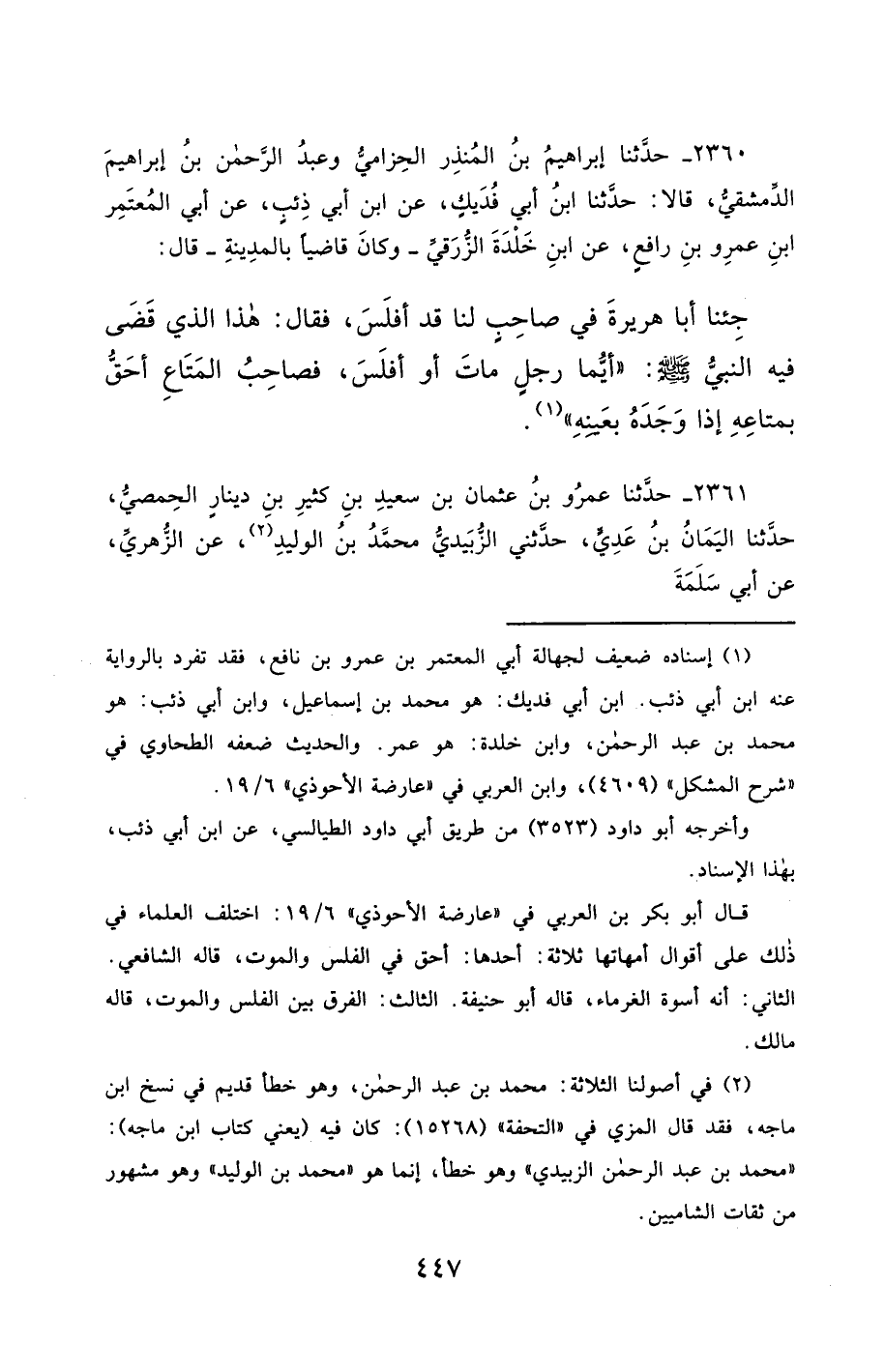 2360- حَدَّثَنَا إِبْرَاهِيمُ بْنُ الْمُنْذِرِ الْحِزَامِيُّ ، وَعَبْدُ الرَّحْمَنِ بْنُ إِبْرَاهِيمَ الدِّمَشْقِيُّ ، قَالاَ : حَدَّثَنَا ابْنُ أَبِي فُدَيْكٍ ، عَنِ ابْنِ أَبِي ذِئْبٍ ، عَنْ أَبِي الْمُعْتَمِرِ بْنِ عَمْرِو بْنِ رَافِعٍ ، عَنِ ابْنِ خَلْدَةَ الزُّرَقِيِّ ، وَكَانَ قَاضِيًا بِالْمَدِينَةِ ، قَالَ : جِئْنَا أَبَا هُرَيْرَةَ فِي صَاحِبٍ لَنَا قَدْ أَفْلَسَ ، فَقَالَ : هَذَا الَّذِي قَضَى فِيهِ النَّبِيُّ صَلَّى الله عَليْهِ وسَلَّمَ : أَيُّمَا رَجُلٍ مَاتَ أَوْ أَفْلَسَ ، فَصَاحِبُ الْمَتَاعِ أَحَقُّ بِمَتَاعِهِ إِذَا وَجَدَهُ بِعَيْنِهِ.