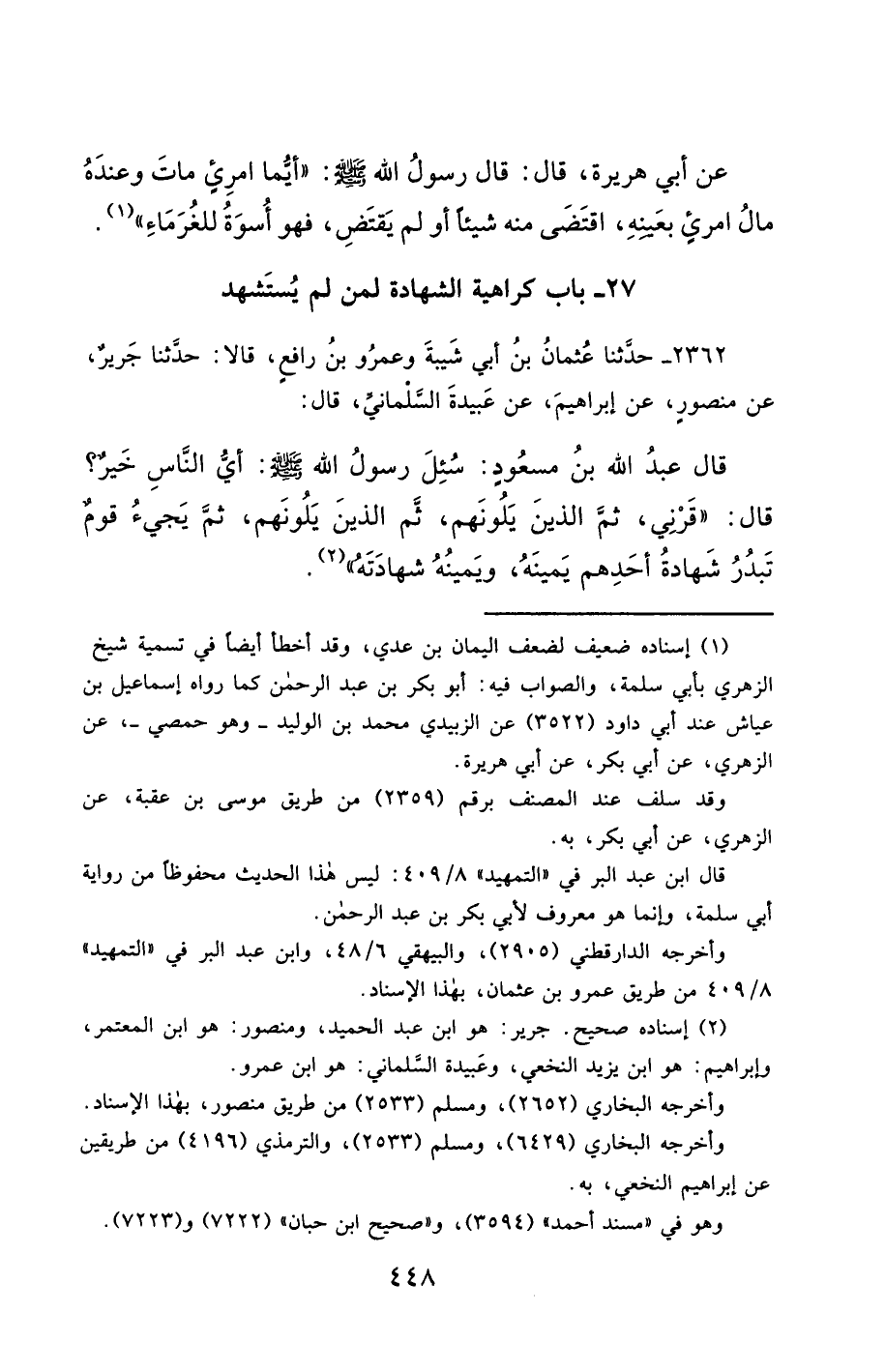 2362- حَدَّثَنَا عُثْمَانُ بْنُ أَبِي شَيْبَةَ ، وَعَمْرُو بْنُ رَافِعٍ ، قَالاَ : حَدَّثَنَا جَرِيرٌ ، عَنْ مَنْصُورٍ ، عَنْ إِبْرَاهِيمَ ، عَنْ عَبِيدَةَ السَّلْمَانِيِّ ، قَالَ : قَالَ عَبْدُ اللهِ بْنُ مَسْعُودٍ : سُئِلَ رَسُولُ اللهِ صَلَّى الله عَليْهِ وسَلَّمَ : أَيُّ النَّاسِ خَيْرٌ ؟ قَالَ : قَرْنِي ، ثُمَّ الَّذِينَ يَلُونَهُمْ ، ثُمَّ الَّذِينَ يَلُونَهُمْ ، ثُمَّ يَجِيءُ قَوْمٌ تَبْدُرُ شَهَادَةُ أَحَدِهِمْ يَمِينَهُ ، وَيَمِينُهُ شَهَادَتَهُ.