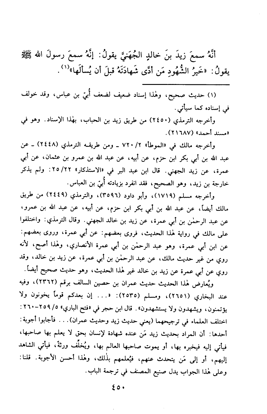 أَنَّهُ سَمِعَ زَيْدَ بْنَ خَالِدٍ الْجُهَنِيَّ يَقُولُ: إِنَّهُ سَمِعَ رَسُولَ اللَّهِ - صَلَّى اللَّهُ عَلَيْهِ وَسَلَّمَ - يَقُولُ: "خَيْرُ الشُّهُودِ مَنْ أَدَّى شَهَادَتَهُ قَبْلَ أَنْ يُسْأَلَهَا" (¬1).