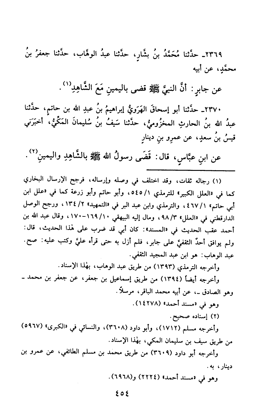 2369- حَدَّثَنَا مُحَمَّدُ بْنُ بَشَّارٍ ، حَدَّثَنَا عَبْدُ الْوَهَّابِ ، حَدَّثَنَا جَعْفَرُ بْنُ مُحَمَّدٍ ، عَنْ أَبِيهِ ، عَنْ جَابِرٍ ، أَنَّ النَّبِيَّ صَلَّى الله عَليْهِ وسَلَّمَ قَضَى بِالْيَمِينِ مَعَ الشَّاهِدِ.
