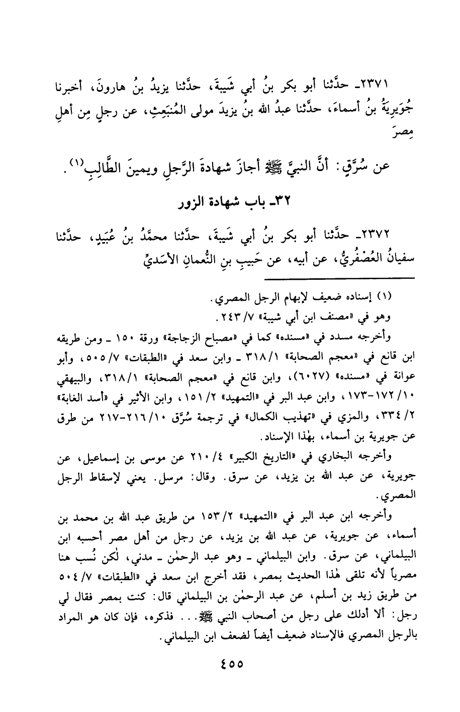 2371- حَدَّثَنَا أَبُو بَكْرِ بْنُ أَبِي شَيْبَةَ ، حَدَّثَنَا يَزِيدُ بْنُ هَارُونَ ، أَخْبَرَنَا جُوَيْرِيَةُ بْنُ أَسْمَاءَ ، حَدَّثَنَا عَبْدُ اللهِ بْنُ يَزِيدَ ، مَوْلَى الْمُنْبَعِثِ ، عَنْ رَجُلٍ مِنْ أَهْلِ مِصْرَ ، عَنْ سُرَّقٍ ، أَنَّ النَّبِيَّ صَلَّى الله عَليْهِ وسَلَّمَ أَجَازَ شَهَادَةَ الرَّجُلِ ، وَيَمِينَ الطَّالِبِ.