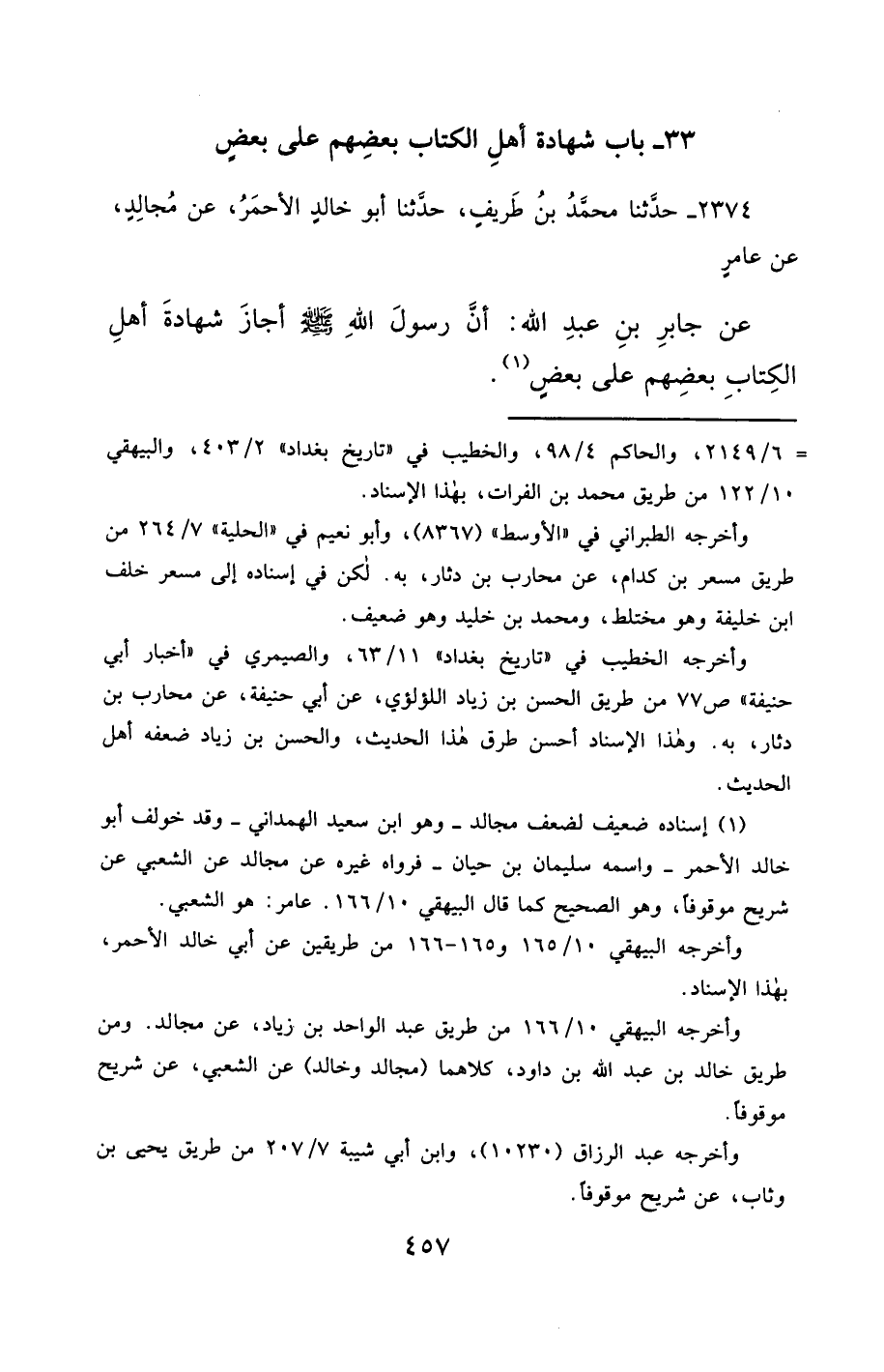 2374- حَدَّثَنَا مُحَمَّدُ بْنُ طَرِيفٍ ، حَدَّثَنَا أَبُو خَالِدٍ الأَحْمَرُ ، عَنْ مُجَالِدٍ ، عَنْ عَامِرٍ ، عَنْ جَابِرِ بْنِ عَبْدِ اللهِ ، أَنَّ رَسُولَ اللهِ صَلَّى الله عَليْهِ وسَلَّمَ أَجَازَ شَهَادَةَ أَهْلِ الْكِتَابِ بَعْضِهِمْ عَلَى بَعْضٍ.