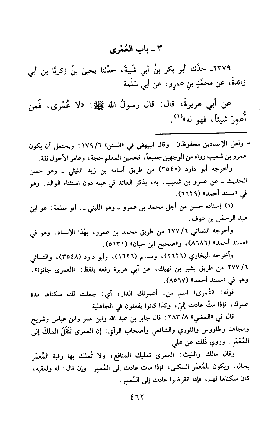 2379- حَدَّثَنَا أَبُو بَكْرِ بْنُ أَبِي شَيْبَةَ ، حَدَّثَنَا يَحْيَى بْنُ زَكَرِيَّا بْنِ أَبِي زَائِدَةَ ، عَنْ مُحَمَّدِ بْنِ عَمْرٍو ، عَنْ أَبِي سَلَمَةَ ، عَنْ أَبِي هُرَيْرَةَ ، قَالَ : قَالَ رَسُولُ اللهِ صَلَّى الله عَليْهِ وسَلَّمَ : لاَ عُمْرَى ، فَمَنْ أُعْمِرَ شَيْئًا فَهُوَ لَهُ.