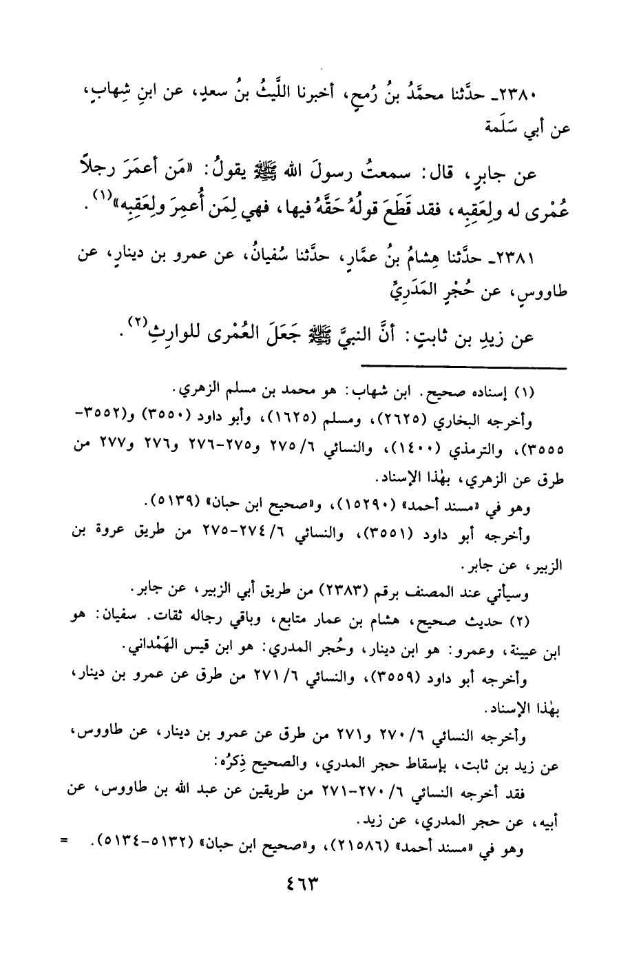 2381- حَدَّثَنَا هِشَامُ بْنُ عَمَّارٍ ، حَدَّثَنَا سُفْيَانُ ، عَنْ عَمْرِو بْنِ دِينَارٍ ، عَنْ طَاوُوسٍ ، عَنْ حُجْرٍ الْمَدَرِيِّ ، عَنْ زَيْدِ بْنِ ثَابِتٍ ، أَنَّ النَّبِيَّ صَلَّى الله عَليْهِ وسَلَّمَ جَعَلَ الْعُمْرَى لِلْوَارِثِ.