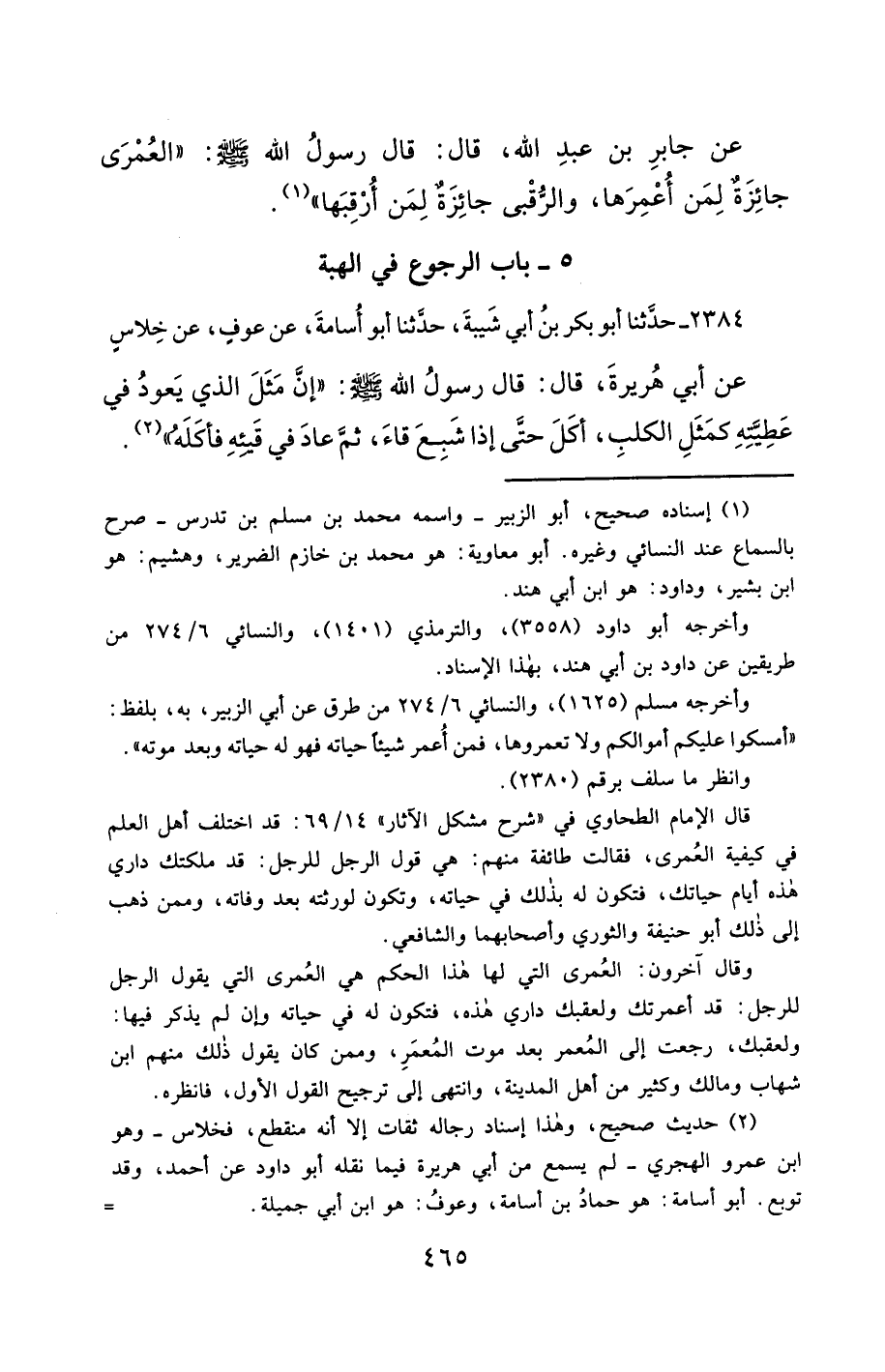 2384- حَدَّثَنَا أَبُو بَكْرِ بْنُ أَبِي شَيْبَةَ ، حَدَّثَنَا أَبُو أُسَامَةَ ، عَنْ عَوْفٍ ، عَنْ خِلاَسٍ ، عَنْ أَبِي هُرَيْرَةَ ، قَالَ : قَالَ رَسُولُ اللهِ صَلَّى الله عَليْهِ وسَلَّمَ : إِنَّ مَثَلَ الَّذِي يَعُودُ فِي عَطِيَّتِهِ ، كَمَثَلِ الْكَلْبِ أَكَلَ ، حَتَّى إِذَا شَبِعَ قَاءَ ، ثُمَّ عَادَ فِي قَيْئِهِ ، فَأَكَلَهُ.