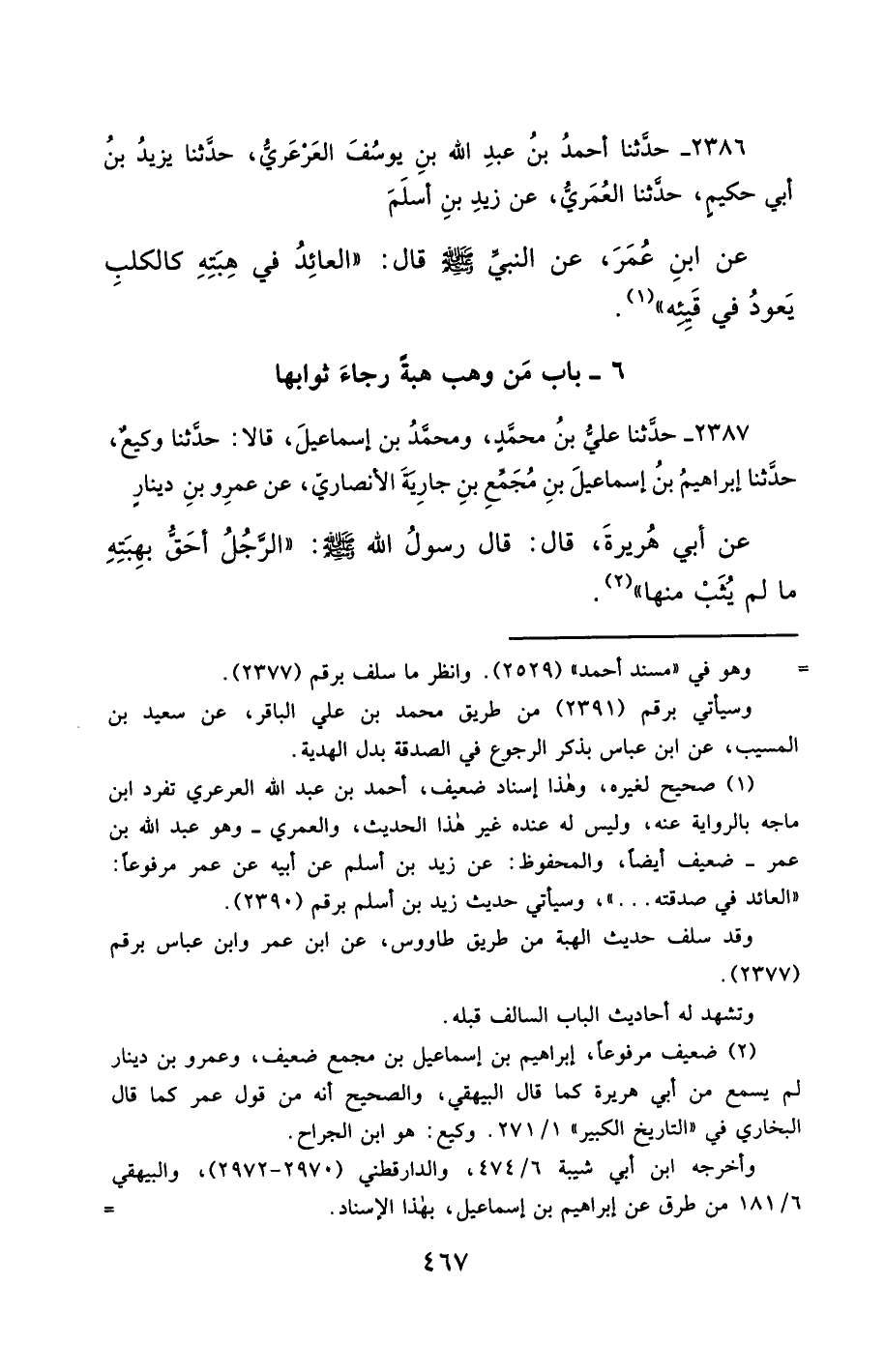 2386- حَدَّثَنَا أَحْمَدُ بْنُ عَبْدِ اللهِ بْنِ يُوسُفَ الْعَرْعَرِيُّ ، حَدَّثَنَا يَزِيدُ بْنُ أَبِي حَكِيمٍ ، حَدَّثَنَا الْعُمَرِيُّ ، عَنْ زَيْدِ بْنِ أَسْلَمَ ، عَنِ ابْنِ عُمَرَ ، عَنِ النَّبِيِّ صَلَّى الله عَليْهِ وسَلَّمَ قَالَ : الْعَائِدُ فِي هِبَتِهِ كَالْكَلْبِ يَعُودُ فِي قَيْئِهِ.