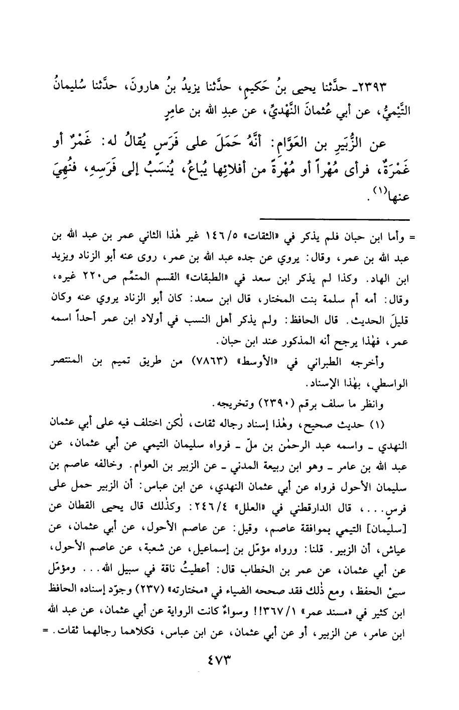 2393- حَدَّثَنَا يَحْيَى بْنُ حَكِيمٍ ، حَدَّثَنَا يَزِيدُ بْنُ هَارُونَ ، حَدَّثَنَا سُلَيْمَانُ التَّيْمِيُّ ، عَنْ أَبِي عُثْمَانَ النَّهْدِيِّ ، عَنْ عَبْدِ اللهِ بْنِ عَامِرٍ ، عَنِ الزُّبَيْرِ بْنِ الْعَوَّامِ ، أَنَّهُ حَمَلَ عَلَى فَرَسٍ يُقَالُ لَهُ : غَمْرٌ أَوْ غَمْرَةٌ ، فَرَأَى مُهْرًا ، أَوْ مُهْرَةً مِنْ أَفْلاَئِهَا يُبَاعُ ، يُنْسَبُ إِلَى فَرَسِهِ ، فَنُهِيَ عَنْهَا.