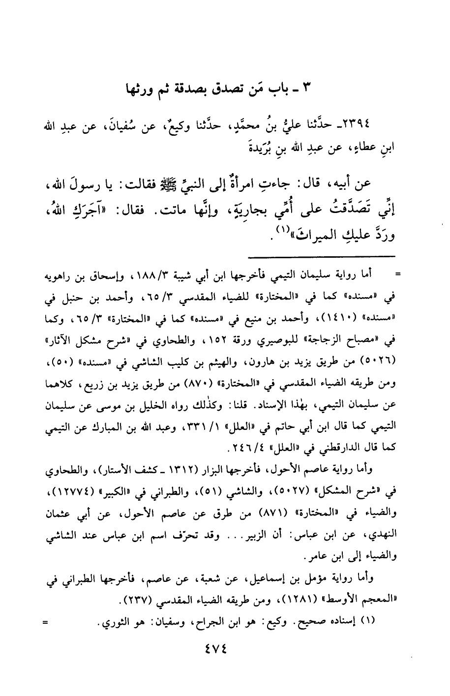 2394- حَدَّثَنَا عَلِيُّ بْنُ مُحَمَّدٍ ، حَدَّثَنَا وَكِيعٌ ، عَنْ سُفْيَانَ ، عَنْ عَبْدِ اللهِ بْنِ عَطَاءٍ ، عَنْ عَبْدِ اللهِ بْنِ بُرَيْدَةَ ، عَنْ أَبِيهِ ، قَالَ : جَاءَتِ امْرَأَةٌ إِلَى النَّبِيِّ صَلَّى الله عَليْهِ وسَلَّمَ ، فَقَالَتْ : يَا رَسُولَ اللهِ ، إِنِّي تَصَدَّقْتُ عَلَى أُمِّي بِجَارِيَةٍ ، وَإِنَّهَا مَاتَتْ ، فَقَالَ : آجَرَكِ اللَّهُ ، وَرَدَّ عَلَيْكِ الْمِيرَاثَ.