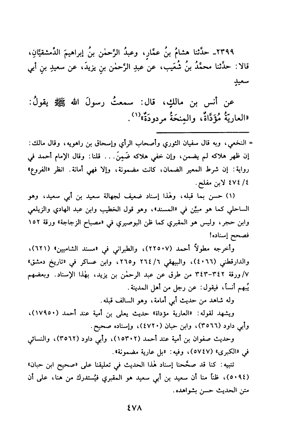 2399- حَدَّثَنَا هِشَامُ بْنُ عَمَّارٍ ، وَعَبْدُ الرَّحْمَنِ بْنُ إِبْرَاهِيمَ الدِّمَشْقِيَّانِ ، قَالاَ : حَدَّثَنَا مُحَمَّدُ بْنُ شُعَيْبٍ ، عَنْ عَبْدِ الرَّحْمَنِ بْنِ يَزِيدَ ، عَنْ سَعِيدِ بْنِ أَبِي سَعِيدٍ ، عَنْ أَنَسِ بْنِ مَالِكٍ ، قَالَ : سَمِعْتُ رَسُولَ اللهِ صَلَّى الله عَليْهِ وسَلَّمَ يَقُولُ : الْعَارِيَّةُ مُؤَدَّاةٌ ، وَالْمِنْحَةُ مَرْدُودَةٌ.