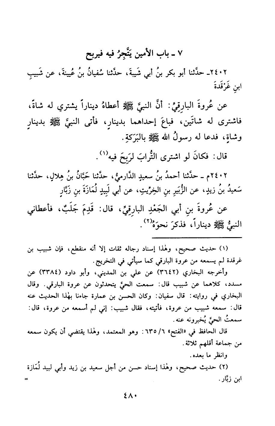 2402- حَدَّثَنَا أَبُو بَكْرِ بْنُ أَبِي شَيْبَةَ ، حَدَّثَنَا سُفْيَانُ بْنُ عُيَيْنَةَ ، عَنْ شَبِيبِ بْنِ غَرْقَدَةَ ، عَنْ عُرْوَةَ الْبَارِقِيِّ ، أَنَّ النَّبِيَّ صَلَّى الله عَليْهِ وسَلَّمَ أَعْطَاهُ دِينَارًا يَشْتَرِي لَهُ شَاةً ، فَاشْتَرَى لَهُ شَاتَيْنِ ، فَبَاعَ إِحْدَاهُمَا بِدِينَارٍ ، فَأَتَى النَّبِيَّ صَلَّى الله عَليْهِ وسَلَّمَ بِدِينَارٍ وَشَاةٍ , فَدَعَا لَهُ رَسُولُ اللهِ صَلَّى الله عَليْهِ وسَلَّمَ بِالْبَرَكَةِ ، قَالَ : فَكَانَ لَوِ اشْتَرَى التُّرَابَ لَرَبِحَ فِيهِ.