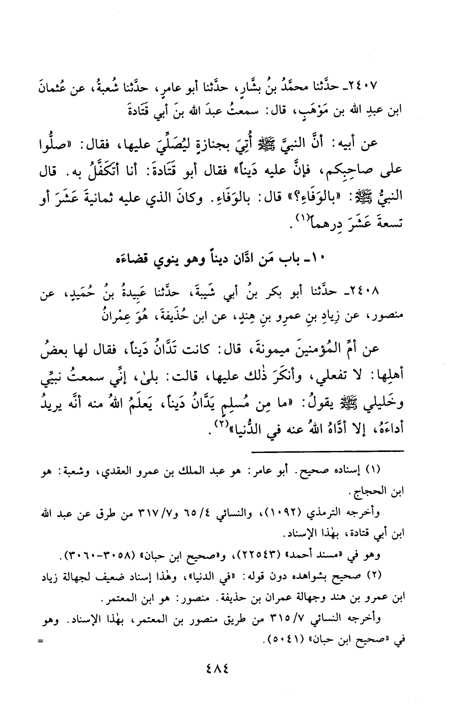 2407- حَدَّثَنَا مُحَمَّدُ بْنُ بَشَّارٍ ، حَدَّثَنَا أَبُو عَامِرٍ ، حَدَّثَنَا شُعْبَةُ ، عَنْ عُثْمَانَ بْنِ عَبْدِ اللهِ بْنِ مَوْهَبٍ ، قَالَ : سَمِعْتُ عَبْدَ اللهِ بْنَ أَبِي قَتَادَةَ ، عَنْ أَبِيهِ ؛ أَنَّ النَّبِيَّ صَلَّى الله عَليْهِ وسَلَّمَ أُتِيَ بِجَنَازَةٍ لِيُصَلِّيَ عَلَيْهَا ، فَقَالَ : صَلُّوا عَلَى صَاحِبِكُمْ ، فَإِنَّ عَلَيْهِ دَيْنًا ، فَقَالَ أَبُو قَتَادَةَ : أَنَا أَتَكَفَّلُ بِهِ ، قَالَ النَّبِيُّ صَلَّى الله عَليْهِ وسَلَّمَ : بِالْوَفَاءِ ؟ قَالَ : بِالْوَفَاءِ ، وَكَانَ الَّذِي عَلَيْهِ ثَمَانِيَةَ عَشَرَ ، أَوْ تِسْعَةَ عَشَرَ دِرْهَمًا.