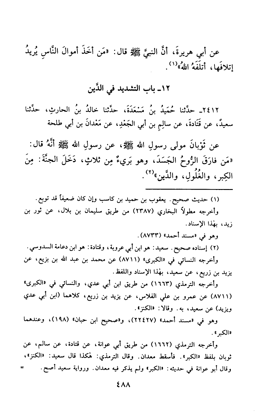 2412- حَدَّثَنَا حُمَيْدُ بْنُ مَسْعَدَةَ ، حَدَّثَنَا خَالِدُ بْنُ الْحَارِثِ ، حَدَّثَنَا سَعِيدٌ ، عَنْ قَتَادَةَ ، عَنْ سَالِمِ بْنِ أَبِي الْجَعْدِ ، عَنْ مَعْدَانَ بْنِ أَبِي طَلْحَةَ ، عَنْ ثَوْبَانَ ، مَوْلَى رَسُولِ اللهِ صَلَّى الله عَليْهِ وسَلَّمَ ، عَنْ رَسُولِ اللهِ صَلَّى الله عَليْهِ وسَلَّمَ ، أَنَّهُ قَالَ : مَنْ فَارَقَ الرُّوحُ الْجَسَدَ وَهُوَ بَرِيءٌ مِنْ ثَلاَثٍ دَخَلَ الْجَنَّةَ : مِنَ الْكِبْرِ ، وَالْغُلُولِ ، وَالدَّيْنِ.