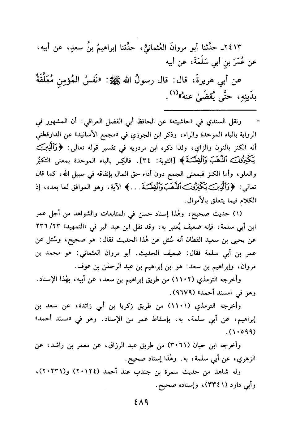 2413- حَدَّثَنَا أَبُو مَرْوَانَ الْعُثْمَانِيُّ ، حَدَّثَنَا إِبْرَاهِيمُ بْنُ سَعْدٍ ، عَنْ أَبِيهِ ، عَنْ عُمَرَ بْنِ أَبِي سَلَمَةَ ، عَنْ أَبِيهِ ، عَنْ أَبِي هُرَيْرَةَ ، قَالَ : قَالَ رَسُولُ اللهِ صَلَّى الله عَليْهِ وسَلَّمَ : نَفْسُ الْمُؤْمِنِ مُعَلَّقَةٌ بِدَيْنِهِ , حَتَّى يُقْضَى عَنْهُ.