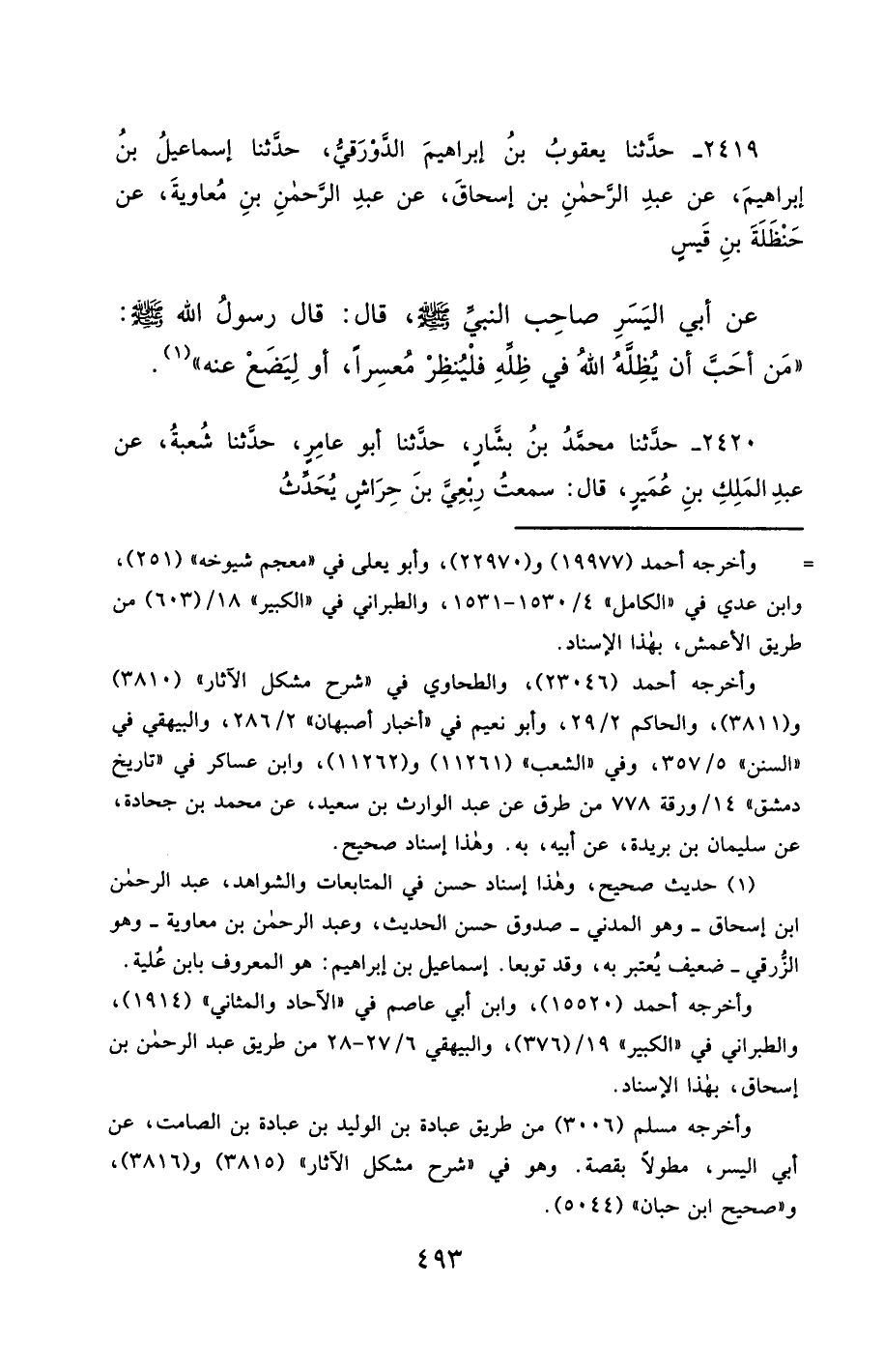 2419- حَدَّثَنَا يَعْقُوبُ بْنُ إِبْرَاهِيمَ الدَّوْرَقِيُّ ، حَدَّثَنَا إِسْمَاعِيلُ بْنُ إِبْرَاهِيمَ ، عَنْ عَبْدِ الرَّحْمَنِ بْنِ إِسْحَاقَ ، عَنْ عَبْدِ الرَّحْمَنِ بْنِ مُعَاوِيَةَ ، عَنْ حَنْظَلَةَ بْنِ قَيْسٍ ، عَنْ أَبِي الْيَسَرِ ، صَاحِبِ النَّبِيِّ صَلَّى الله عَليْهِ وسَلَّمَ ، قَالَ : قَالَ رَسُولُ اللهِ صَلَّى الله عَليْهِ وسَلَّمَ : مَنْ أَحَبَّ أَنْ يُظِلَّهُ اللَّهُ فِي ظِلِّهِ ، فَلْيُنْظِرْ مُعْسِرًا ، أَوْ لِيَضَعْ عَنْهُ.