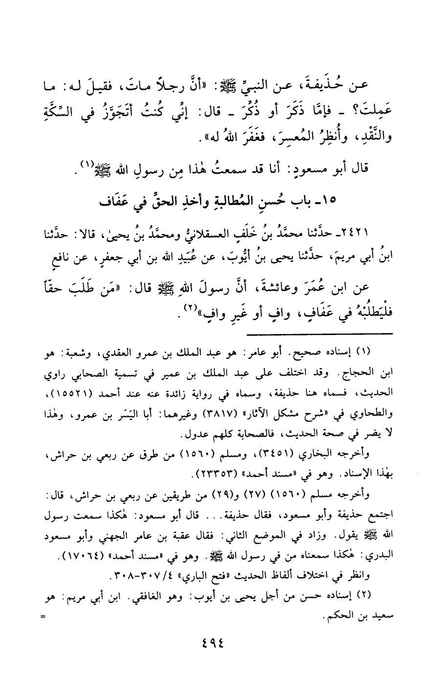 2421- حَدَّثَنَا مُحَمَّدُ بْنُ خَلَفٍ الْعَسْقَلاَنِيُّ ، وَمُحَمَّدُ بْنُ يَحْيَى ، قَالاَ : حَدَّثَنَا ابْنُ أَبِي مَرْيَمَ ، حَدَّثَنَا يَحْيَى بْنُ أَيُّوبَ ، عَنْ عُبَيْدِ اللهِ بْنِ أَبِي جَعْفَرٍ ، عَنْ نَافِعٍ ، عَنِ ابْنِ عُمَرَ ، وَعَائِشَةَ ، أَنَّ رَسُولَ اللهِ صَلَّى الله عَليْهِ وسَلَّمَ قَالَ : مَنْ طَلَبَ حَقًّا فَلْيَطْلُبْهُ فِي عَفَافٍ وَافٍ ، أَوْ غَيْرِ وَافٍ.