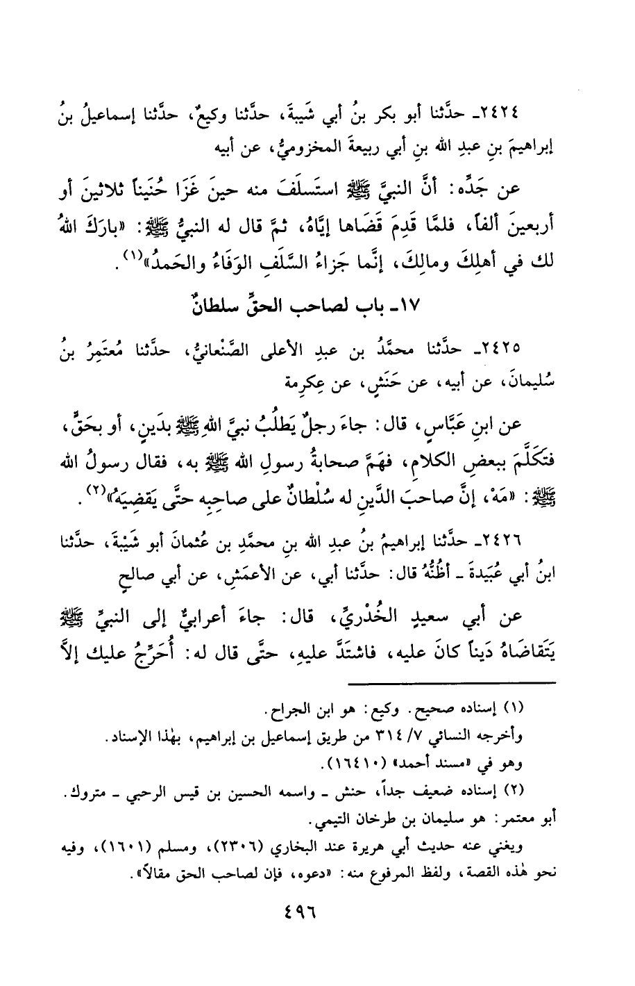 2424- حَدَّثَنَا أَبُو بَكْرِ بْنُ أَبِي شَيْبَةَ ، حَدَّثَنَا وَكِيعٌ ، حَدَّثَنَا إِسْمَاعِيلُ بْنُ إِبْرَاهِيمَ بْنِ عَبْدِ اللهِ بْنِ أَبِي رَبِيعَةَ الْمَخْزُومِيُّ ، عَنْ أَبِيهِ ، عَنْ جَدِّهِ ، أَنَّ النَّبِيَّ صَلَّى الله عَليْهِ وسَلَّمَ اسْتَسْلَفَ مِنْهُ حِينَ غَزَا حُنَيْنًا ثَلاَثِينَ أَوْ أَرْبَعِينَ أَلْفًا ، فَلَمَّا قَدِمَ قَضَاهَا إِيَّاهُ ، ثُمَّ قَالَ لَهُ النَّبِيُّ صَلَّى الله عَليْهِ وسَلَّمَ : بَارَكَ اللَّهُ لَكَ فِي أَهْلِكَ وَمَالِكَ ، إِنَّمَا جَزَاءُ السَّلَفِ الْوَفَاءُ وَالْحَمْدُ.
