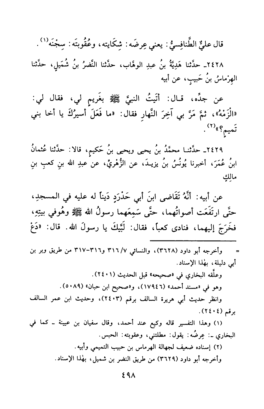 2428- حَدَّثَنَا هَدِيَّةُ بْنُ عَبْدِ الْوَهَّابِ ، حَدَّثَنَا النَّضْرُ بْنُ شُمَيْلٍ ، حَدَّثَنَا الْهِرْمَاسُ بْنُ حَبِيبٍ ، عَنْ أَبِيهِ ، عَنْ جَدِّهِ ، قَالَ : أَتَيْتُ النَّبِيَّ صَلَّى الله عَليْهِ وسَلَّمَ بِغَرِيمٍ لِي ، فَقَالَ لِي : الْزَمْهُ ، ثُمَّ مَرَّ بِي آخِرَ النَّهَارِ ، فَقَالَ : مَا فَعَلَ أَسِيرُكَ يَا أَخَا بَنِي تَمِيمٍ ؟.
