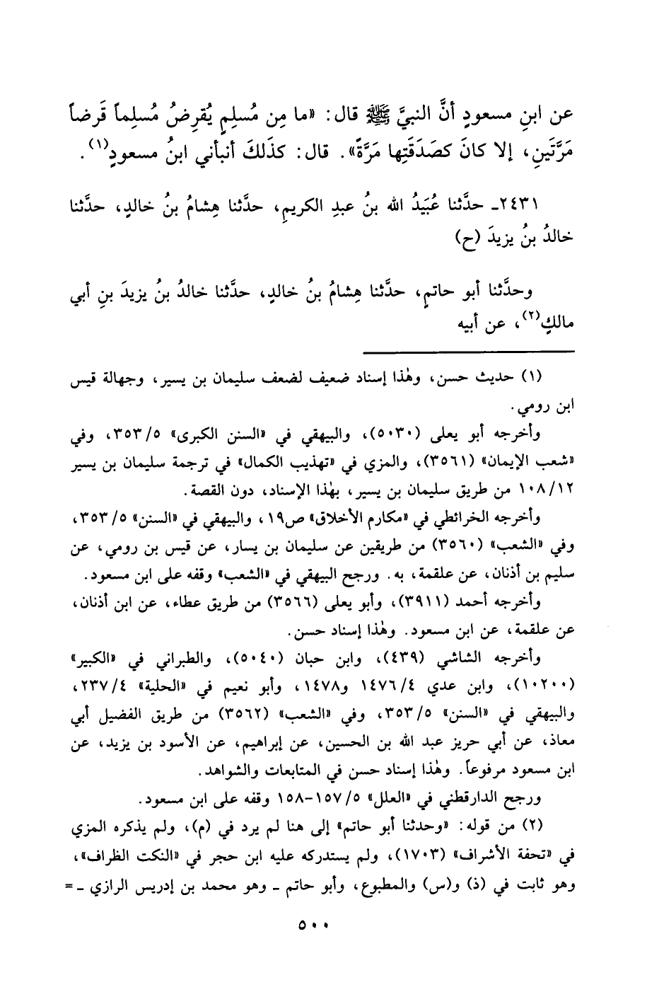 2431- حَدَّثَنَا عُبَيْدُ اللهِ بْنُ عَبْدِ الْكَرِيمِ ، حَدَّثَنَا هِشَامُ بْنُ خَالِدٍ ، حَدَّثَنَا خَالِدُ بْنُ يَزِيدَ (ح) وحَدَّثَنَا أَبُو حَاتِمٍ ، حَدَّثَنَا هِشَامُ بْنُ خَالِدٍ ، حَدَّثَنَا خَالِدُ بْنُ يَزِيدَ بْنِ أَبِي مَالِكٍ ، عَنْ أَبِيهِ ، عَنْ أَنَسِ بْنِ مَالِكٍ ، قَالَ : قَالَ رَسُولُ اللهِ صَلَّى الله عَليْهِ وسَلَّمَ : رَأَيْتُ لَيْلَةَ أُسْرِيَ بِي عَلَى بَابِ الْجَنَّةِ مَكْتُوبًا : الصَّدَقَةُ بِعَشْرِ أَمْثَالِهَا ، وَالْقَرْضُ بِثَمَانِيَةَ عَشَرَ ، فَقُلْتُ : يَا جِبْرِيلُ , مَا بَالُ الْقَرْضِ أَفْضَلُ مِنَ الصَّدَقَةِ ؟ قَالَ : لأَنَّ السَّائِلَ يَسْأَلُ وَعِنْدَهُ ، وَالْمُسْتَقْرِضُ لاَ يَسْتَقْرِضُ إِلاَّ مِنْ حَاجَةٍ.
